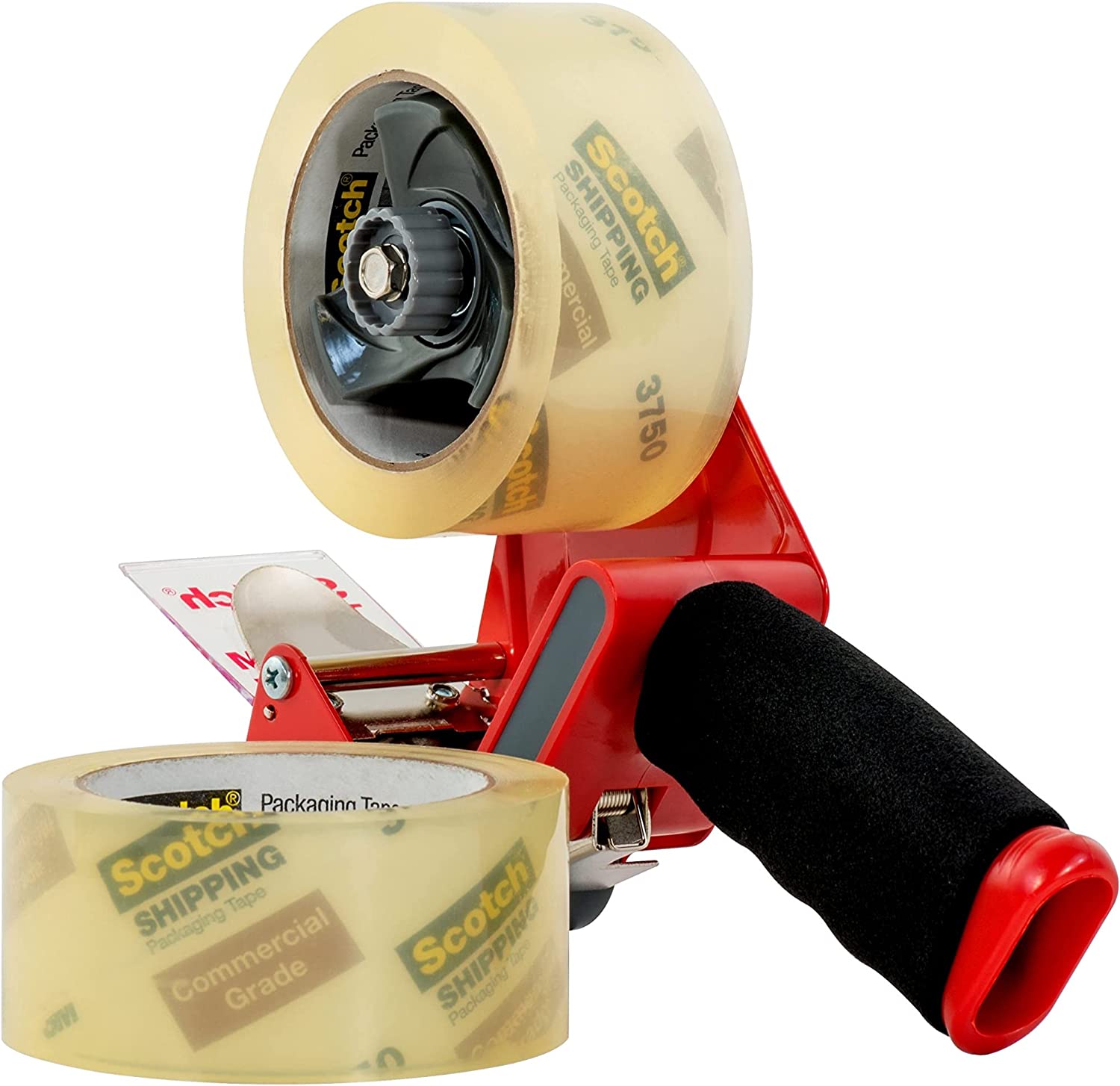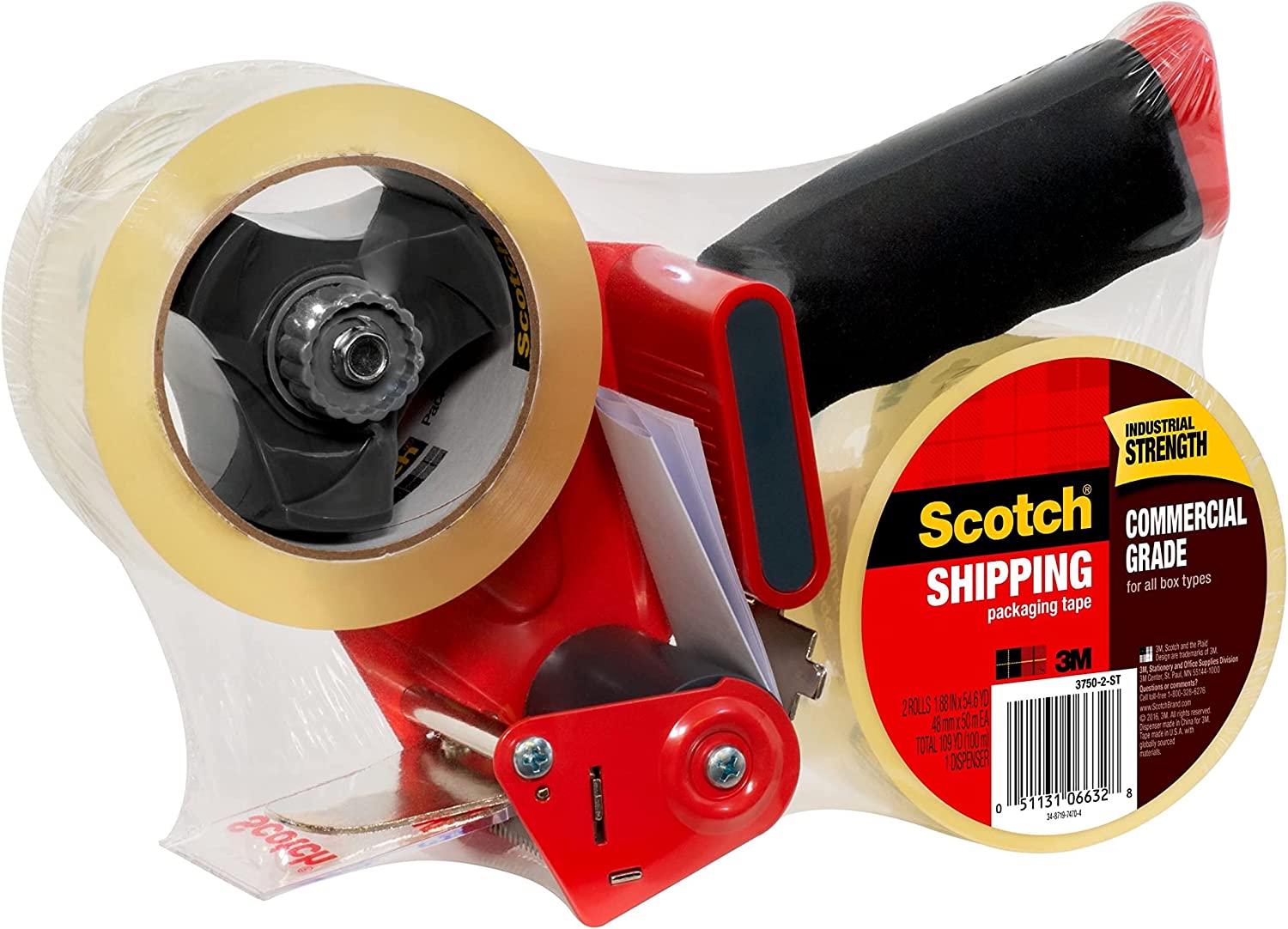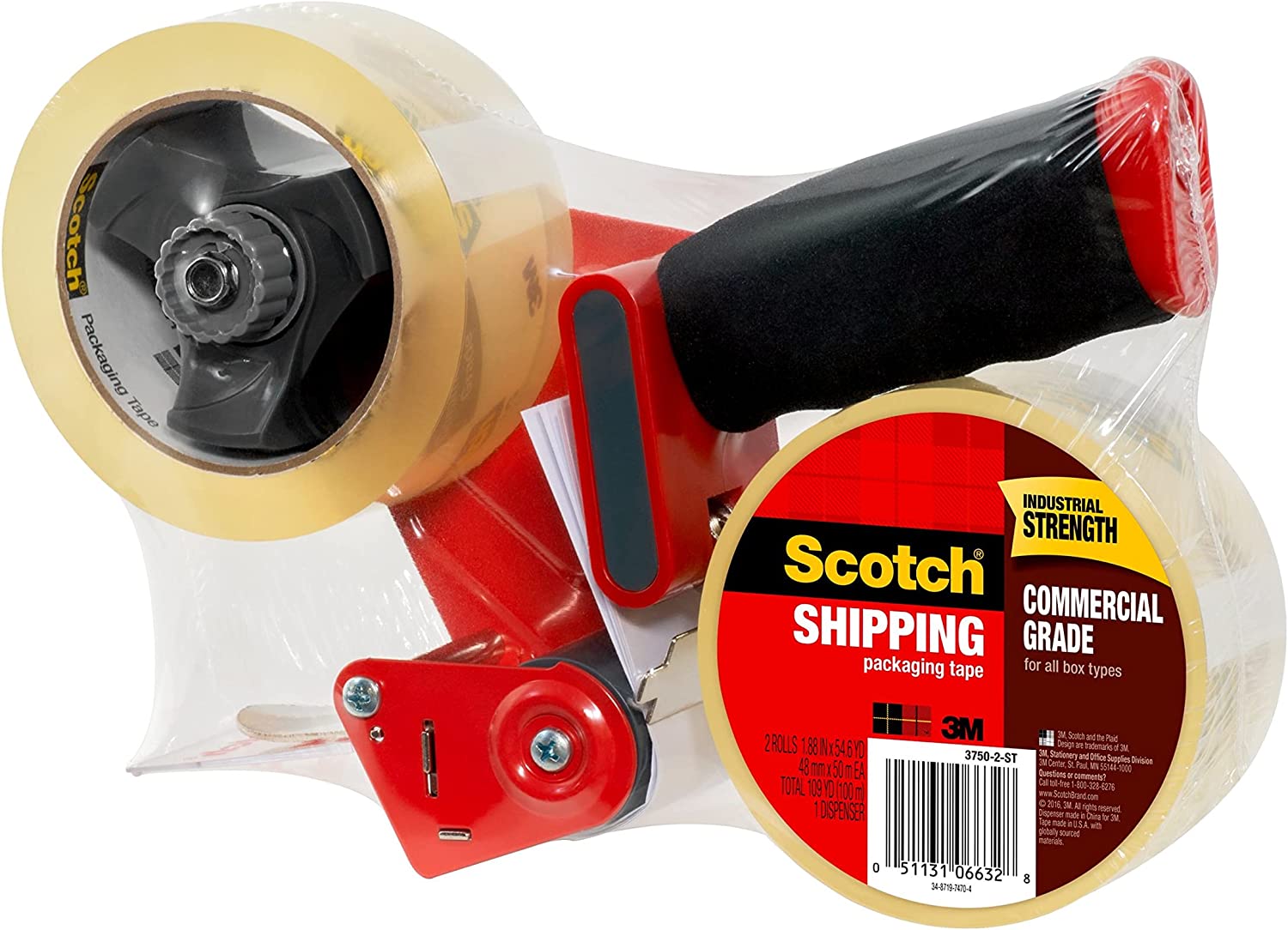 Scotch Commercial Grade Shipping Packaging Tape, 1.88" x 54.6 yd, Designed for Packing, Shipping and Mailing, Guaranteed to Stay Sealed, 3" Core, Clear, 2 Rolls w/1 Dispenser (3750-2-ST)