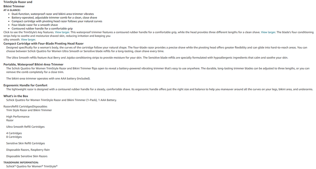 For a smooth shave wherever you need, the Schick Quattro for Women TrimStyle Razor and Bikini Trimmer offers dual function in an easy-to-use, compact tool. A vibrating, pivoting head with four blades provides greater flexibility and allows you to follow the natural curves of your legs and body. The battery-powered trimmer is ideal for your bikini area and offers three length settings for a close, clean shave.