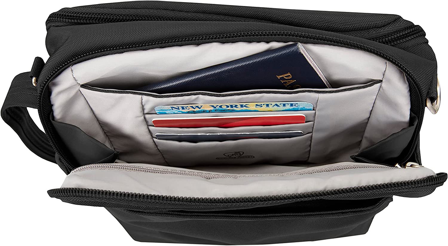 Locking compartments, slash-resistant body construction and slash-resistant, adjustable shoulder strap attaches to post or chair