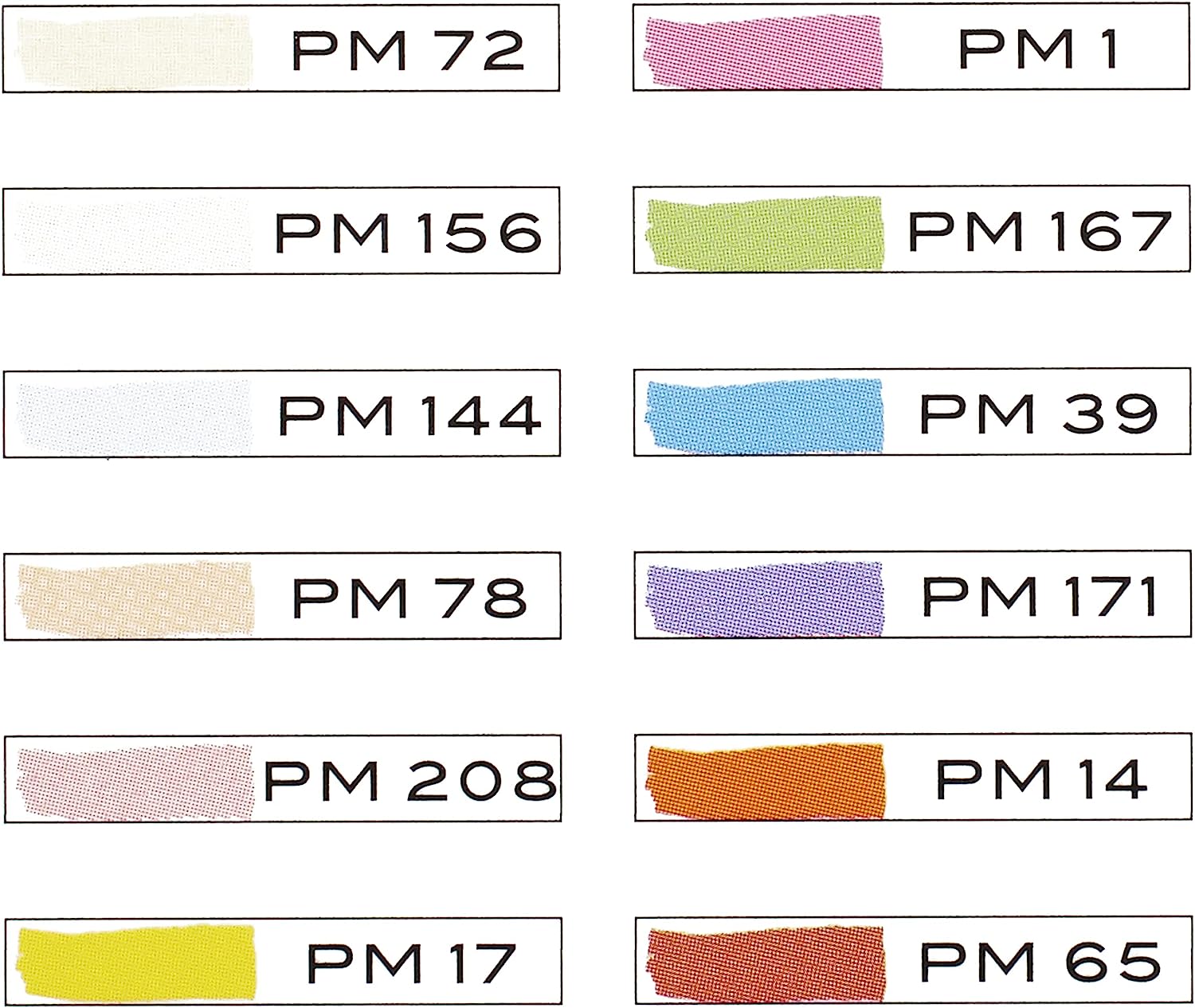 • Includes: Eggshell: PM72, French Grey 20%: PM156, Cloud Blue: PM144, Brick Beige: PM78, Ballet Pink: PM208, Sunburst Yellow: PM17, Process Red: PM1, Apple Green: PM164, True Blue: PM39, Lilac: PM171, Pale Vermillion: PM14 and Sienna Brown: PM65 Manga art markers