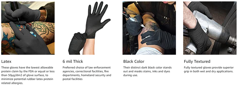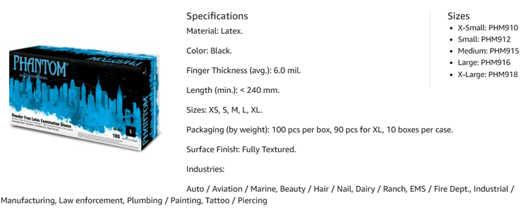 Phantom latex gloves have received some of the highest ratings from tattoo, piercing, body art artists and high-end hair salon and beauty professionals. Their distinct dark black color stands out and masks stains, inks and dyes during use. Because of their dark black color, and their stretchability, flexibility and dexterity from natural rubber latex material, they are also the preferred choice of law enforcement agencies, correctional facilities, fire departments, homeland security and postal facilities These gloves have the lowest allowable protein claim by the FDA or equal or less than 50µg/dm2 of glove surface, to minimize potential rubber latex protein related allergies. The textured surface provides superior grip in both wet and dry applications.