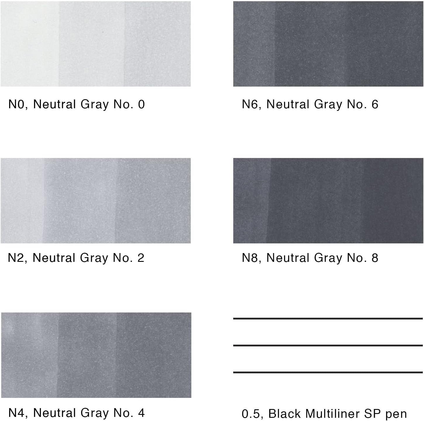 • This 6 piece Sketching Grays set includes a combination of neutral gray colors N0, N2, N4, N6, N8, and a black 0.5 Multiliner SP pen. This set is perfect for sketching, designing, and illustrating.