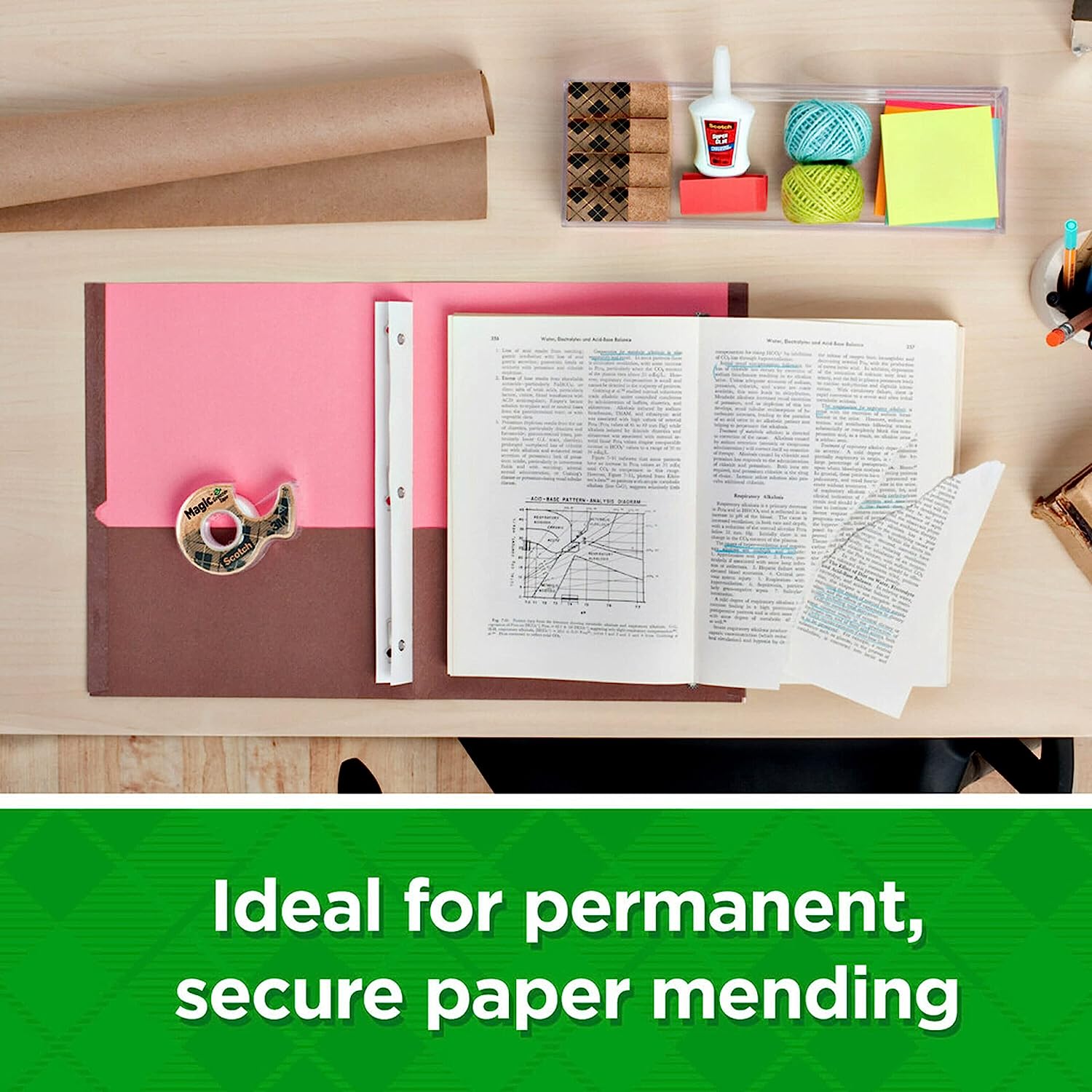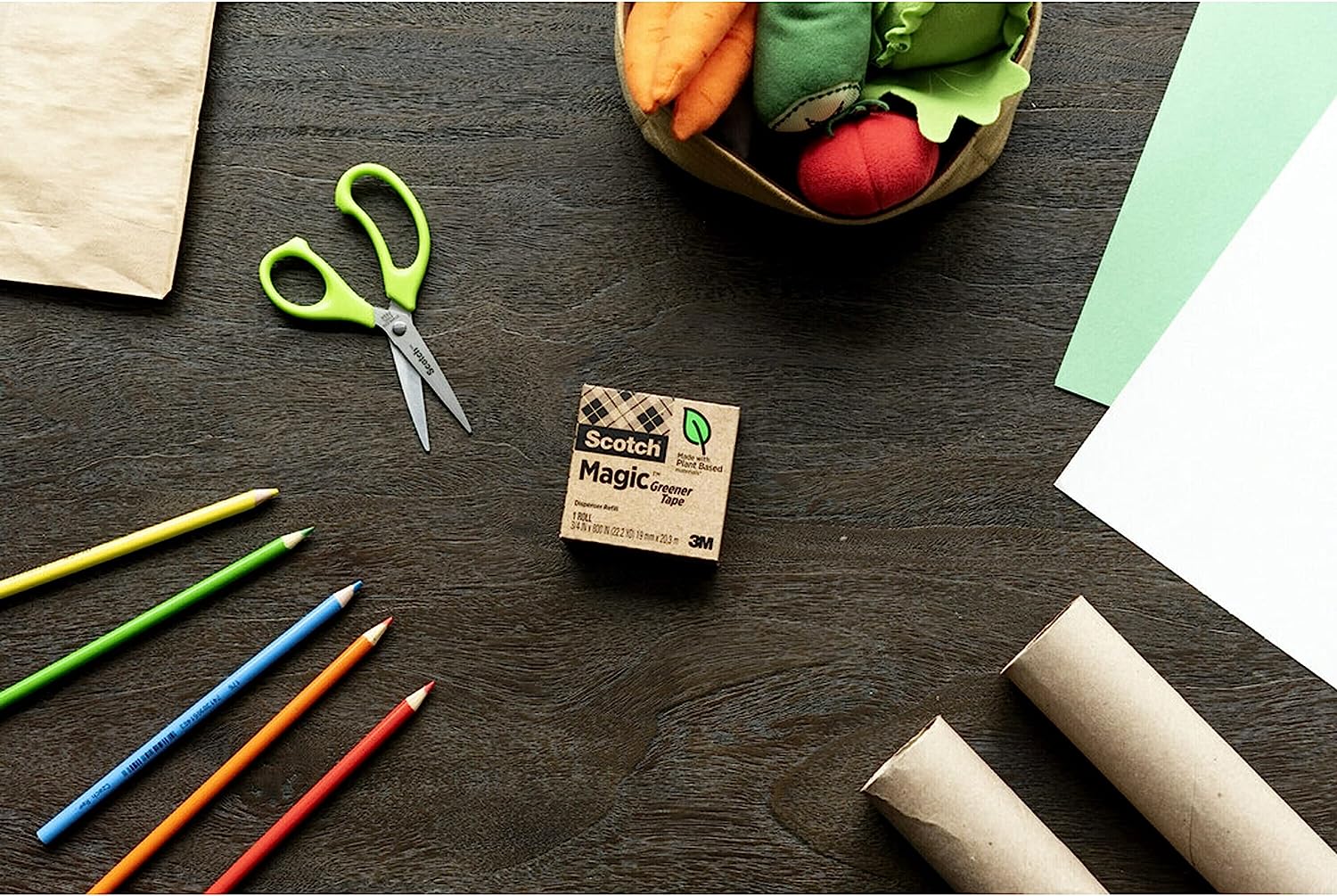 When important documents and school projects need mending and you also want to help the environment it's Scotch Magic Greener Tape for the many rips and tears you have around the house. Scotch Magic Greener Tape has all the strength of our Magic Tape. All the holding power of Magic Tape. Disappears just like our tried and true Magic Tape. But because Magic Greener Tape is made from over 65% recycled or plant-based material, it's the more eco conscious choice. It comes with the easy to use Scotch Tape Dispenser, so the tape glides off smoothly, cuts evenly, with no waste. Works like magic because it's just like Magic Tape. Only Greener.