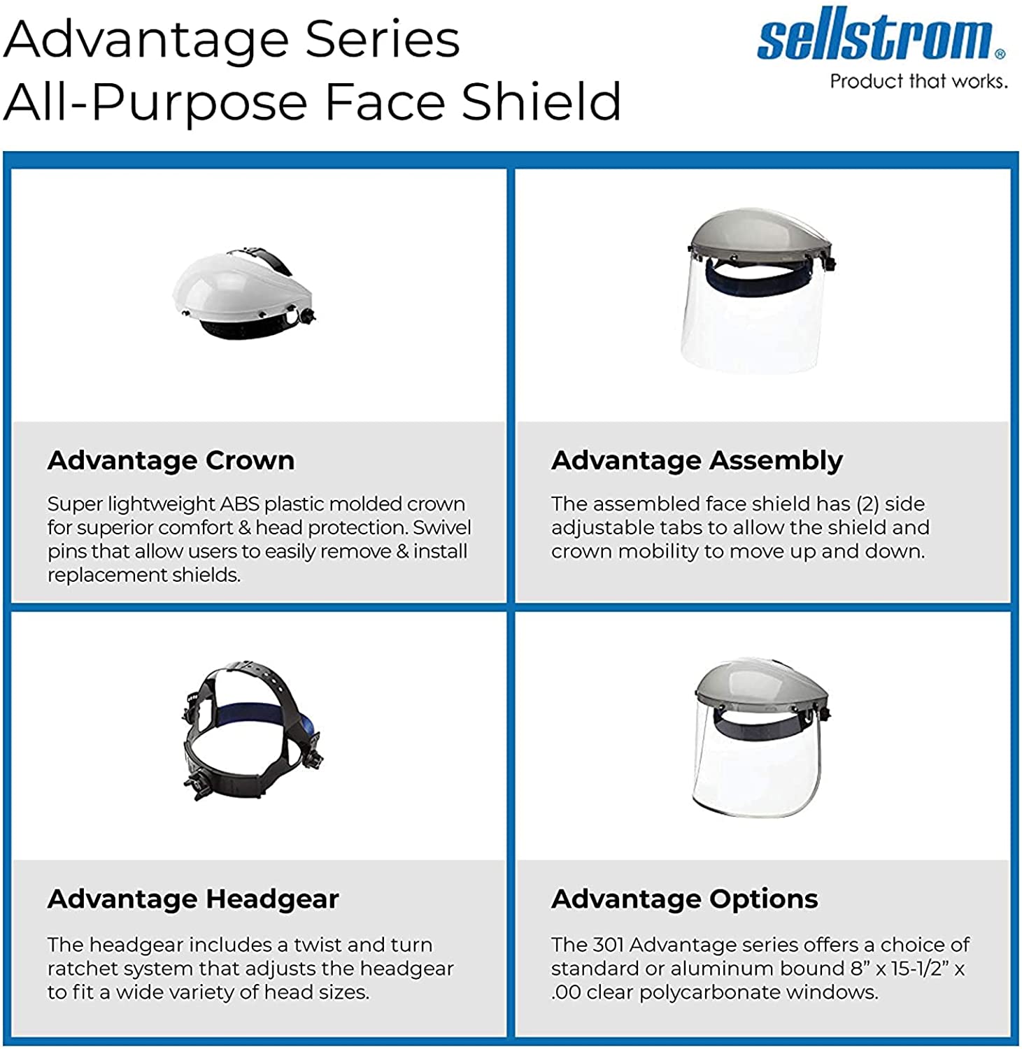 NO ASSEMBLY NEEDED: The 301 Advantage series arrives fully assembled. Just remove the protective film from both sides of face shield before using