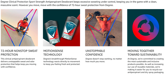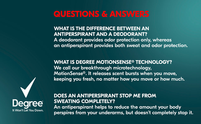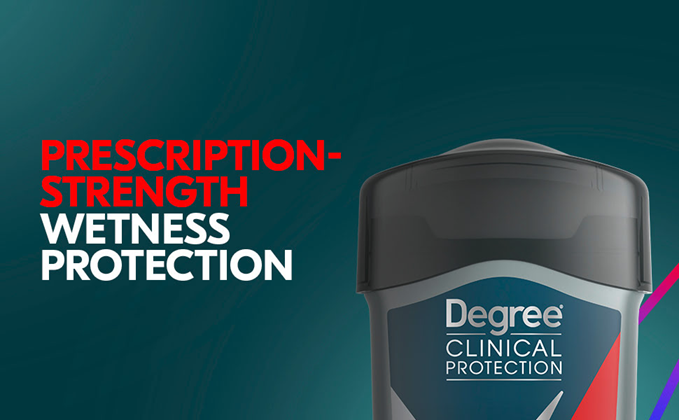 Degree Men Clinical Protection Sport Strength Antiperspirant Deodorant delivers prescription-strength wetness protection with 72-hour sweat and odor control to keep you feeling dry and fresh. Our breakthrough MotionSense technology works in sync with your body, all day long. This antiperspirant deodorant releases a clean, masculine scent every time you move. The powerful, prescription-strength antiperspirant deodorant responds when you need it most, so you can stay confident without having to worry about slowing down. Only Degree MotionSense technology keeps you fresher with every move. Degree MotionSense technology works like this: unique microcapsules sit on the surface of your skin. When you move, friction breaks those microcapsules, and they release more fragrance. So, every time you move, MotionSense keeps you fresh and free from odor. You can be confident you’ll enjoy non-stop protection from sweat and odor by this antiperspirant for men. Stay fresh and feel clean from morning to night. Simply twist, glide and get moving. Stay dry, cool, and confident thanks to Degree Men Clinical Protection Sport Strength Antiperspirant Deodorant. At Degree, we want to inspire the confidence in everyone to move more and go further. We’re here to support your journey through an antiperspirant that moves with you and helps you go beyond your limits. As well as increasing our use of reusable materials, we’re making it easier for you to recycle our antiperspirant and dry spray packaging. Degree. It won’t let you down.