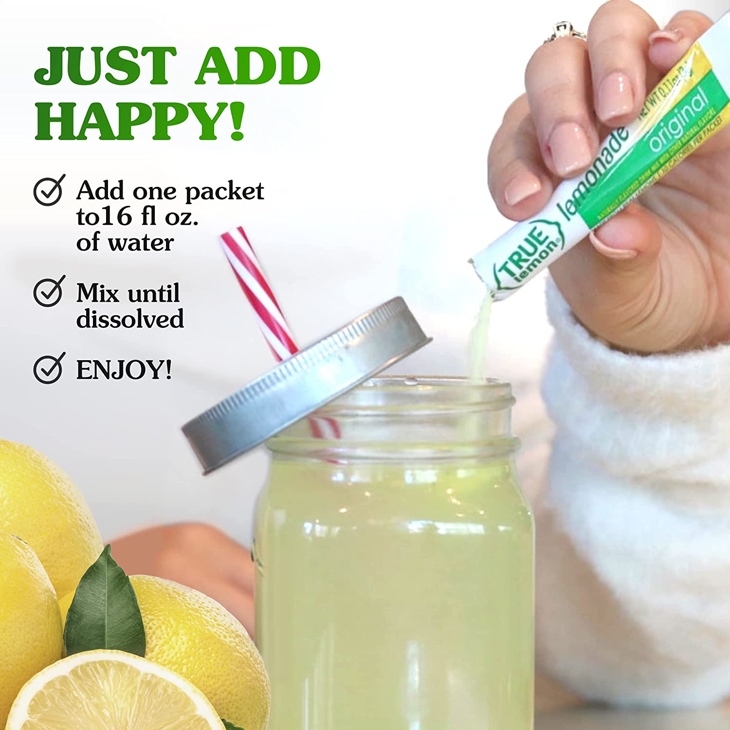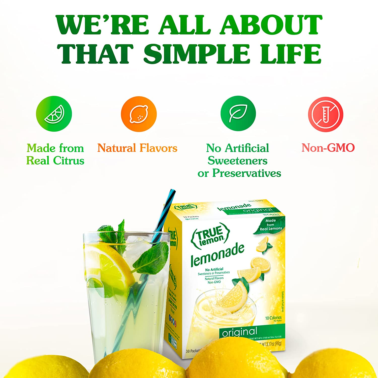 • TRUE LEMON ORIGINAL LEMONADE DRINK MIX: Made from real lemon juice and oils and naturally sweetened with stevia, our lemonade drink mix is made with simple and clean ingredients that you can pronounce