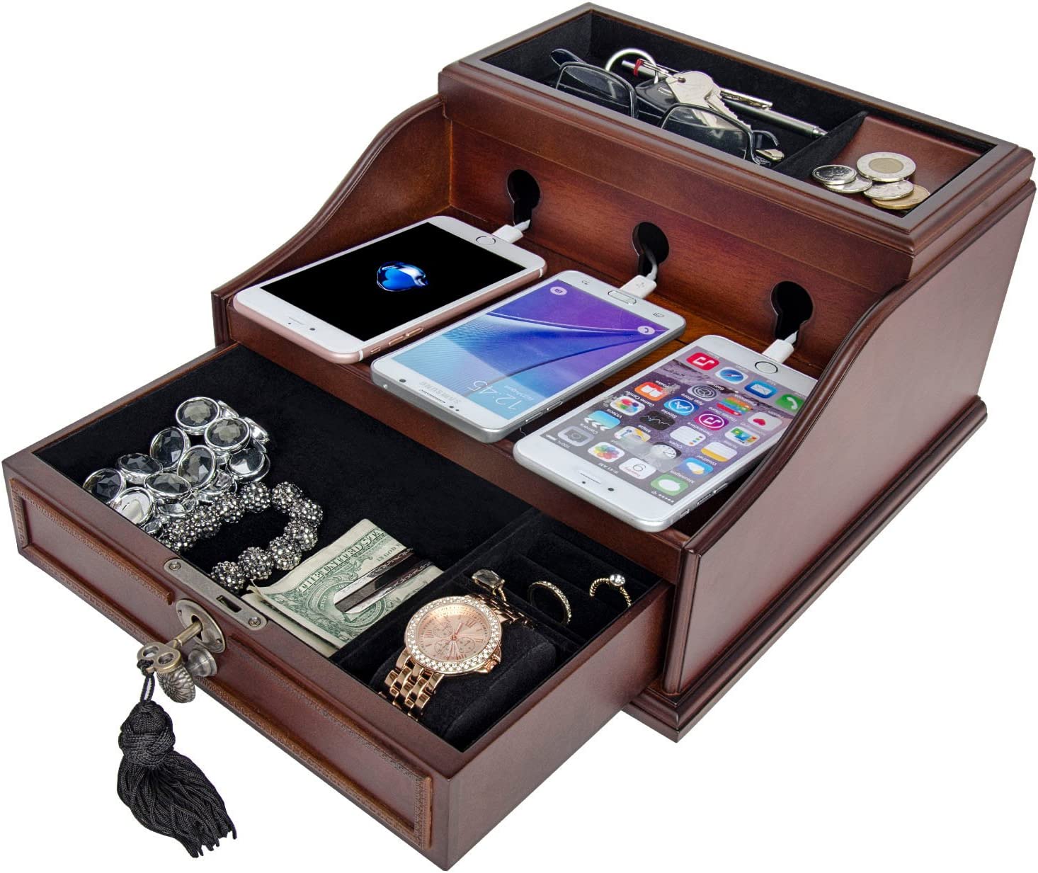 Arolly Wood Finish Valet Charging Station Multi Device Cord Organizer with Pull Out Drawer Compatible with iPhone, Samsung, and other Smartphones, Can Store Watches, Jewelry and more