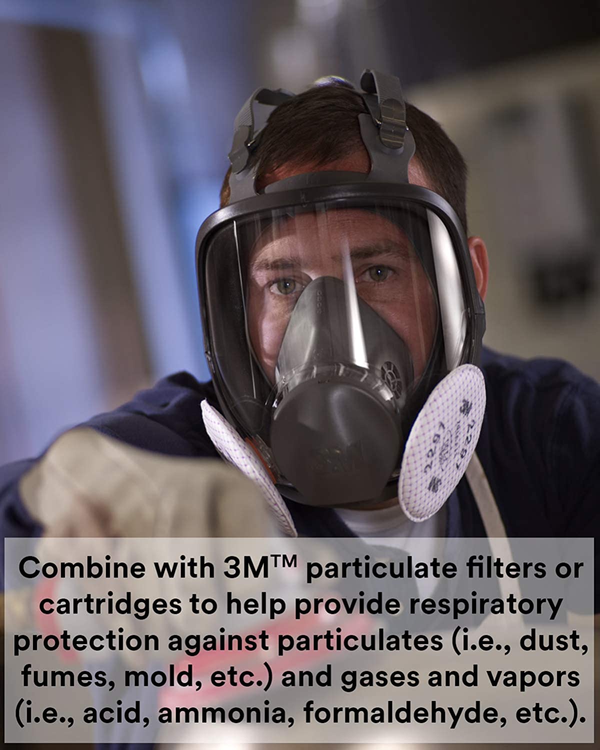 This full facepiece reusable respirator offers lightweight comfort and ease of use. Combine with appropriate 3M particulate filters or cartridges to help provide respiratory protection against particulates or a variety of gases and vapors. The 3M Full Facepiece Reusable Respirator 6000 Series helps provide protection against certain airborne contaminants. Versatile—use with 3M particulate filters, gas/vapor cartridges and supplied air respirator systems. The 3M Cool Flow Valve helps make breathing easier. These features combine to make a comfortable, practical and economical solution. Recommended applications include assembly, chemical clean-up, chemical handling, chemical splash, chipping, chiseling, cleaning, furnace operations, grinding, laboratories, machining, masonry, painting, pouring/casting, sanding, and sawing. Industries in which this full face respirator are commonly used include agriculture, construction, general manufacturing, pharmaceuticals, and primary metals. NIOSH, a Federal government regulatory agency, has tested and approved the 3M Full Facepiece Reusable Respirator 6000 Series with 3M cartridges, filters or PAPR and supplied air systems to help reduce breathing certain airborne contaminants. The 3M Full Facepiece Reusable Respirator 6000 Series facepiece also meets the impact requirements of the ANSI Z87.1-2010 standard, high impact level for face and eye protection. The facepiece works with these approved 3M filters and accessories: 2071, 2076HF, 2078, 2091/07000, 2096, 2097/07184, 2291, 2296, 2297, 7093, 7093C/37173, 603, 5N11, 5P71/07194, 501, and 502. It also works with the following 3M Cartridges 6000 Series: 6001, 6001i, 6002, 6003, 6004, 6005, 6006, 6009, 60921, 60921i, 60922, 60923, 60924, 60925, 60926, 60928, and 60929S. Breathing hazardous particles, gases and vapors can be harmful to your health. With proper fit, use, and the appropriate cartridge/filter, the 3M Full Facepiece Reusable Respirator 6000 Series helps reduce exposure to many contaminants (i.e., dust, mists, fumes, mold, bacteria, paints, acids, ammonia, chlorine, other chemicals, etc.). Enhanced comfort and visibility features make wearing the respirator noticeably more enjoyable. Warning: Respirators help protect against certain airborne contaminants. Before use, the wearer must read and understand the User Instructions provided as a part of the product packaging. Follow all local regulations. In the U.S., a written respiratory protection program must be implemented meeting all the requirements of OSHA 29 CFR 1910.134 including training, fit testing and medical evaluation. In Canada, CSA standards Z94.4 requirements must be met and/or requirements of the applicable jurisdiction, as appropriate. Misuse may result in sickness or death.