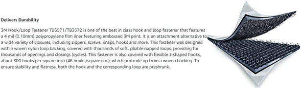 3M Hook/Loop Fastener TB3571/TB3572 is our best in class fastener that provides design flexibility and fast product assembly. With its high performance acrylic-based pressure sensitive adhesive backing, this fastener allows for easy and convenient attachment to a variety of substrates including some high surface energy plastics such as polycarbonate, acrylic, ABS, polystyrene.