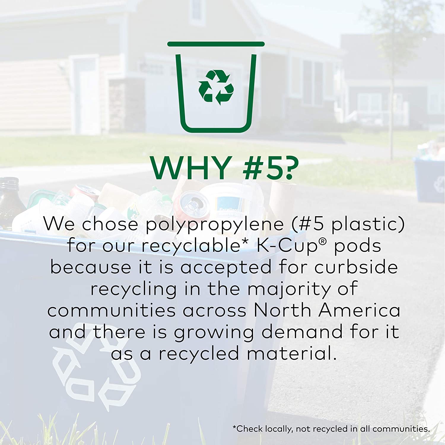 • RECYCLABLE K-CUP PODS: Simple. Delicious. And Recyclable. Enjoy the same great-tasting coffee you know and love, and when you’re done just peel, empty and recycle. Check locally, not recycled in all communities. Packaging may vary.