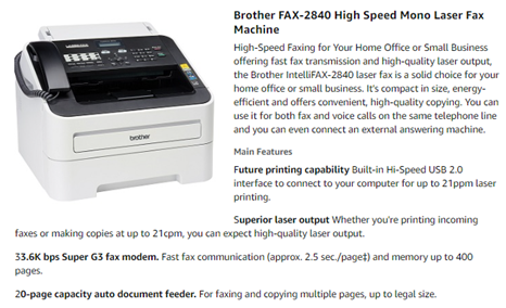 Brother FAX-2840 High Speed Mono Laser Fax Machine, Dark/light gray - FAX2840 17.750x18.125x16.625