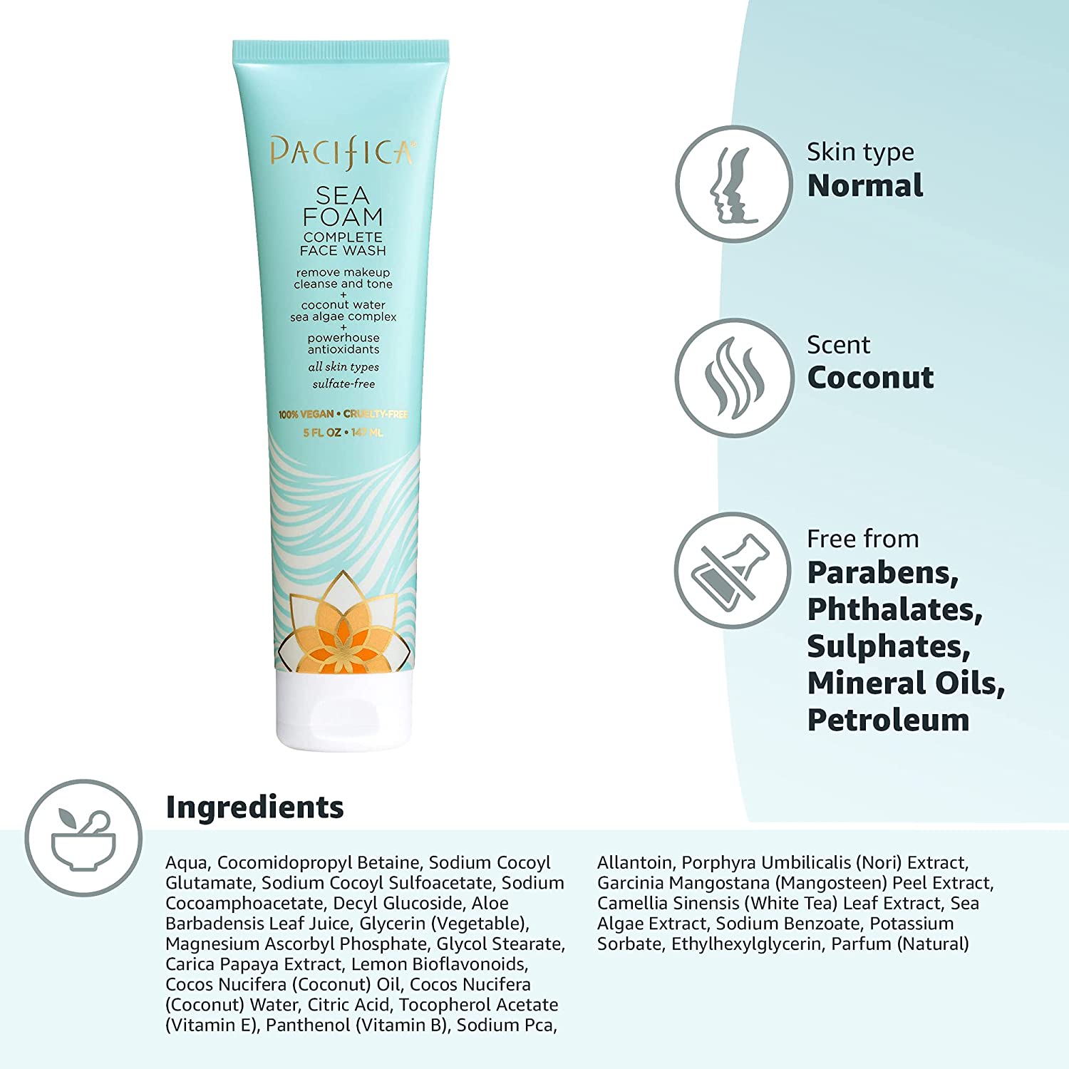 Pacifica Beauty Sea Foam Face Cleanser, Daily Gentle Foaming Face Wash, With Coconut Water + Sea Algae Complex, Removes Makeup, For Combination and Oily Skin, Vegan and Cruelty Free, Clean Skin Care
