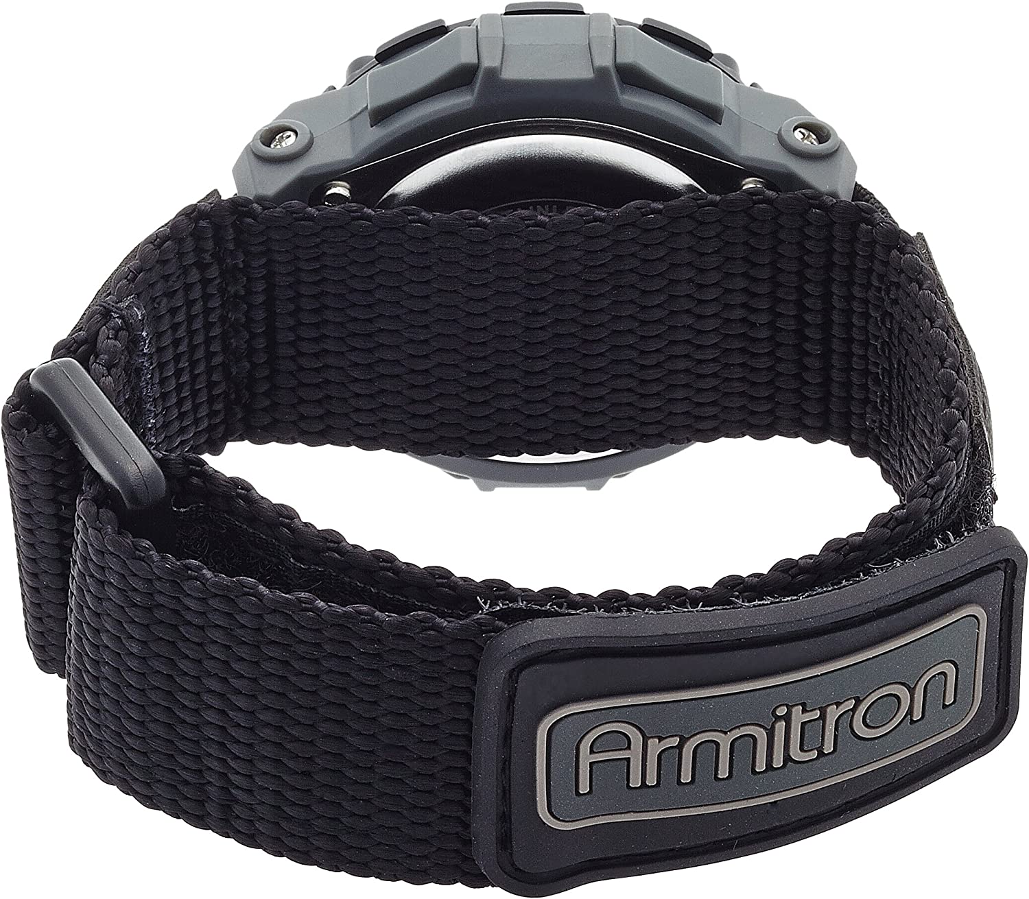 The Black Nylon Strap Grey Round Digital Chronograph Watch includes all the features needed for a casual sport watch and has a high tech look that. The round, grey resin case and black bezel feature polished silver-tone screws and white printing. The digital dial displays the time in Arabic numerals along with day of week, date and seconds across the top. Other functions of this watch include chronograph functions, alarm, lap timer, dual time, and military time. The comfortable, black, nylon strap is designed with stitched patches and a rubber Armitron graphic. Strap securely fastens with a nylon and loop closure. This timepiece offers reliable quartz movement and is water-resistant to a depth of 330 feet (100 meters).