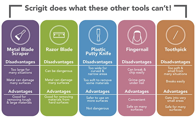 • Save Your Nails with Scrigit Scraper - The ultimate multi-use plastic scraper tool! This super simple tool works for so many daily tasks around your home. Not only is it an ideal dried-on food scraper tool, it works great as a label scraper, sticker remover tool and lottery ticket scratcher tool.