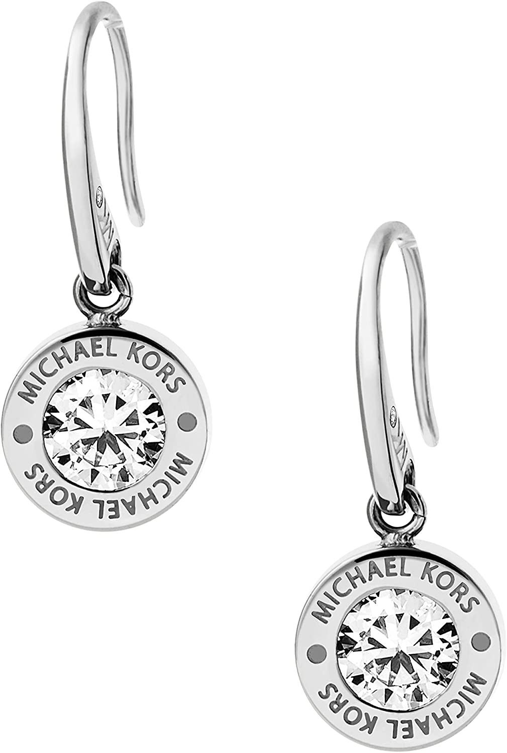 These stainless steel drop earrings feature the classic Michael Kors logo surrounded by sparkling pave crystals.