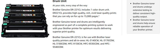 • Brother genuine drum unit: The Brother DR-221CL Drum Unit is intelligently engineered as part of a complete color printing system.