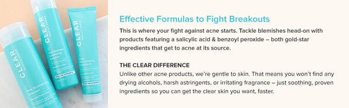 Paula's Choice CLEAR skin care line includes our Pore Normalizing Cleanser with Salicylic Acid, Daily Skin Clearing Treatment with Benzoyl Peroxide, Anti-Redness Exfoliating Solution with 2% Salicylic Acid (BHA), Ultra-Light Daily Hydrating Fluid with SPF 30+, and the Oil-Free Moisturizer.