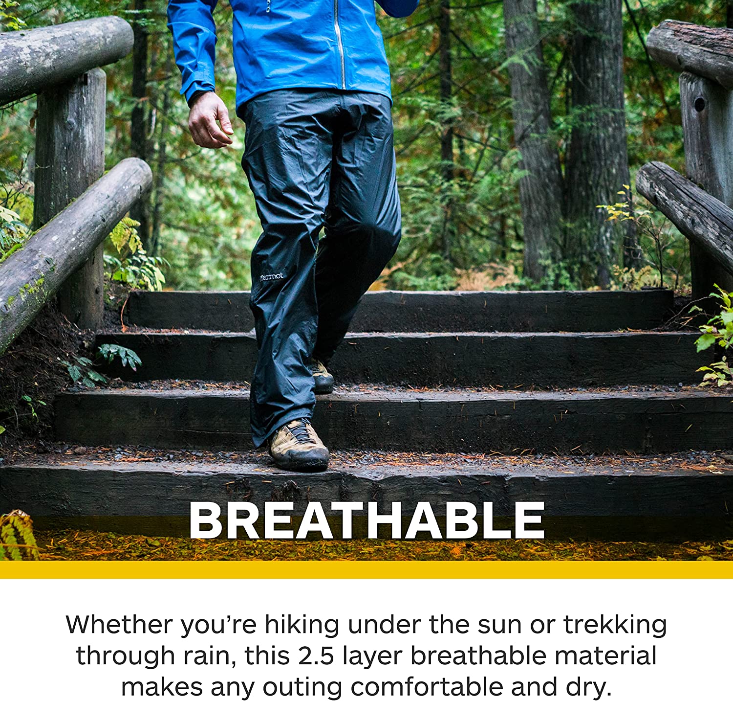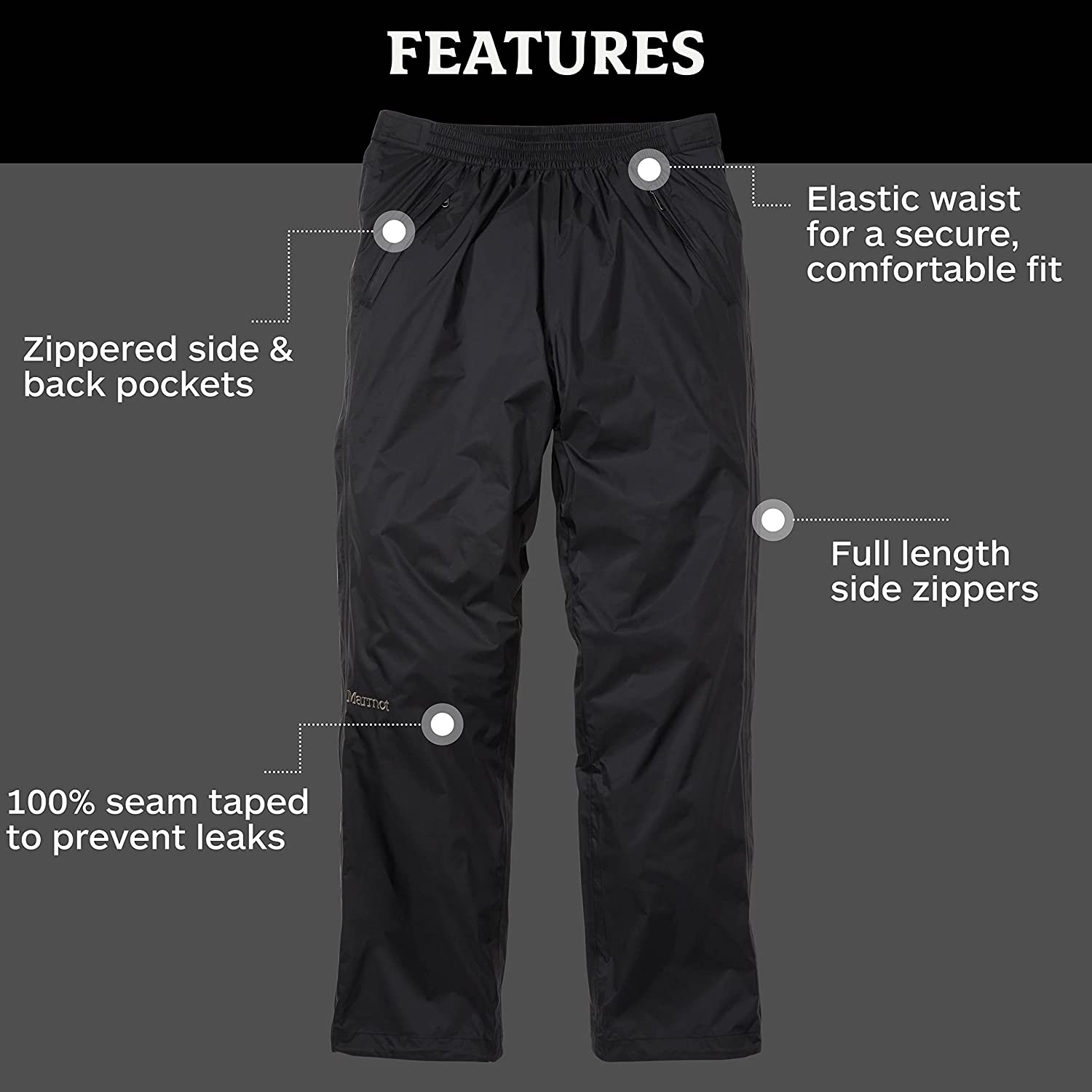 • Innovating To Improve The Human Experience - Marmot strives to deliver best-in-class warmth, protection and ease of use on every product. The PreCip pants feature fully taped seams to prevent leaks and bonded storm flaps over the zippers to keep moisture out. Zippered side pockets and back pocket provide quick storage for your personal items.