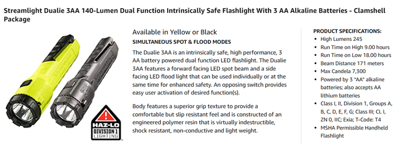 See what's ahead of you and around you with the intrinsically safe3AA ProPolymer Dualie. It produces a focused spot light and soft flood lightto illuminate your work area and help to avoid slips, trips and falls.