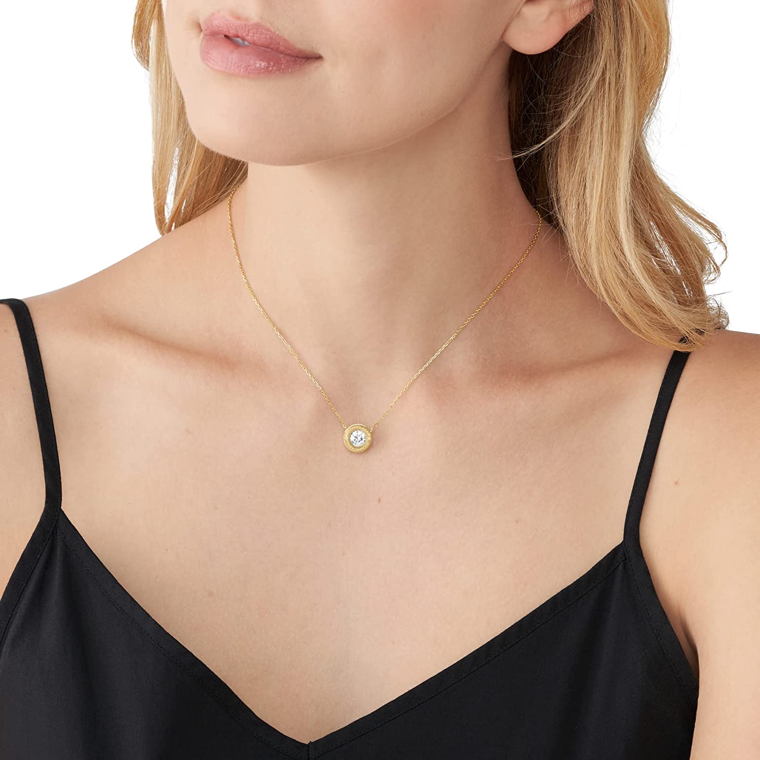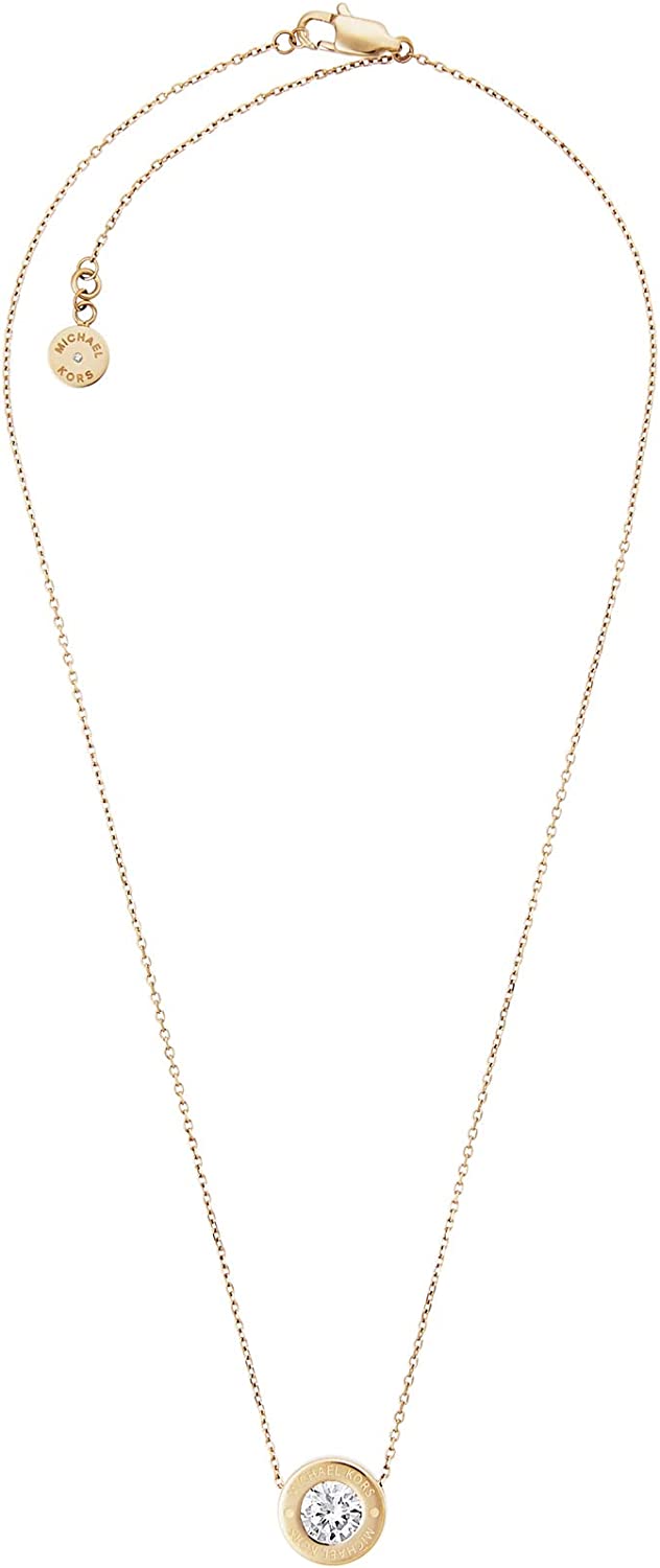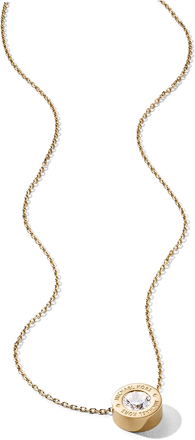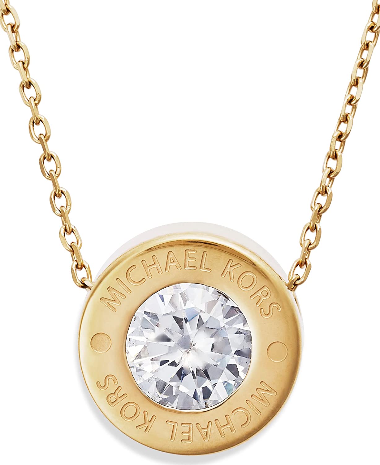 • Perfect as a chic stand-alone piece or for layering, this gold-tone Michael Kors Jewelry necklace features a brilliant-cut crystal in a thick, MK logo-engraved bezel pendant setting