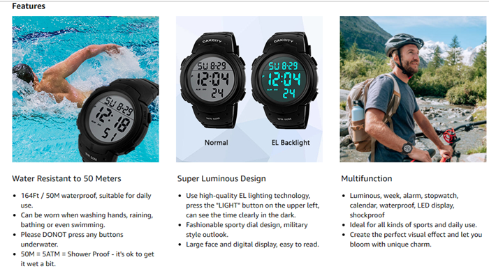 • Mens watch:Appeals to mens, especially to those who like doing sports, shock resistant, stop watch, military 24H time mode, and LED back light functions make it perfect for all kind of sport and daily use