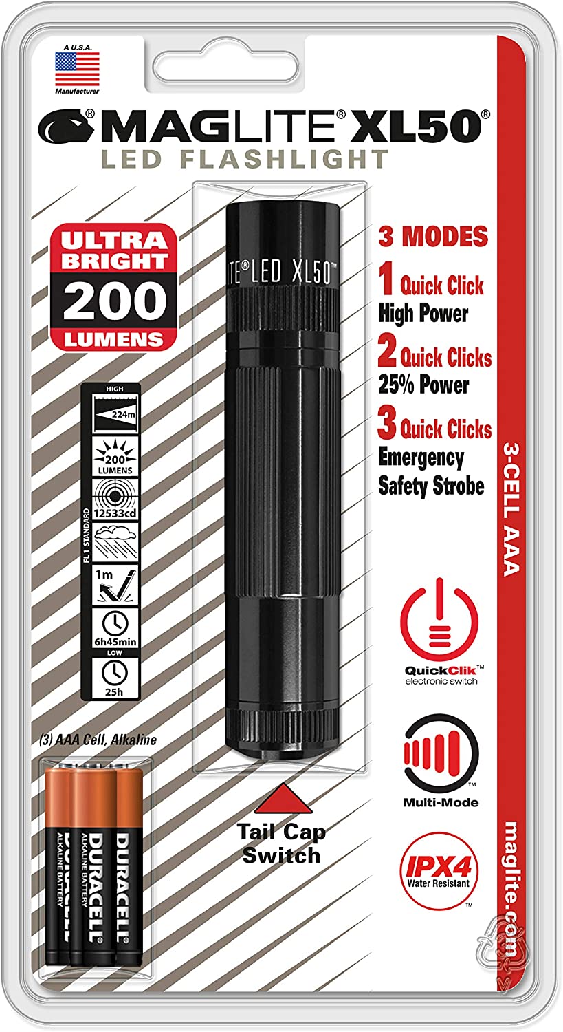 Introducing the Maglite XL50 3-cell AAA LED flashlight. The Maglite LED XL50 flashlight, with its compact, pocket-size design and adjustable LED spot-to-flood beam, features a rear push-button tail cap switch coupled with three modes: high power, 25% energy save power, and emergency strobe. This flashlight has an impact-resistant and durable aluminum casing that helps keep it protected. With Intelligent Energy Source Management, the brightness and effective power usage is continuously monitored, allowing for prolonged battery life. Uses three AAA alkaline batteries (included).