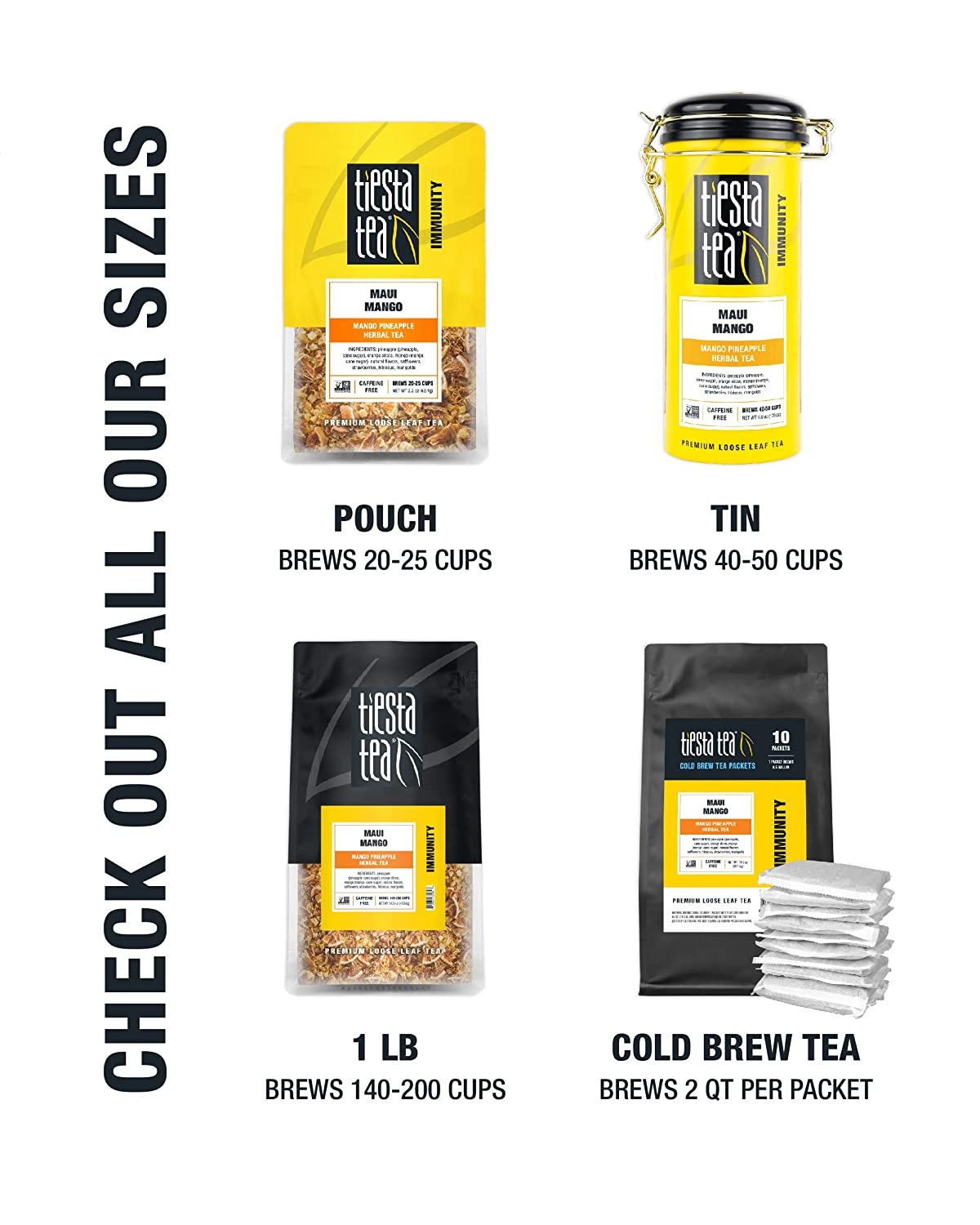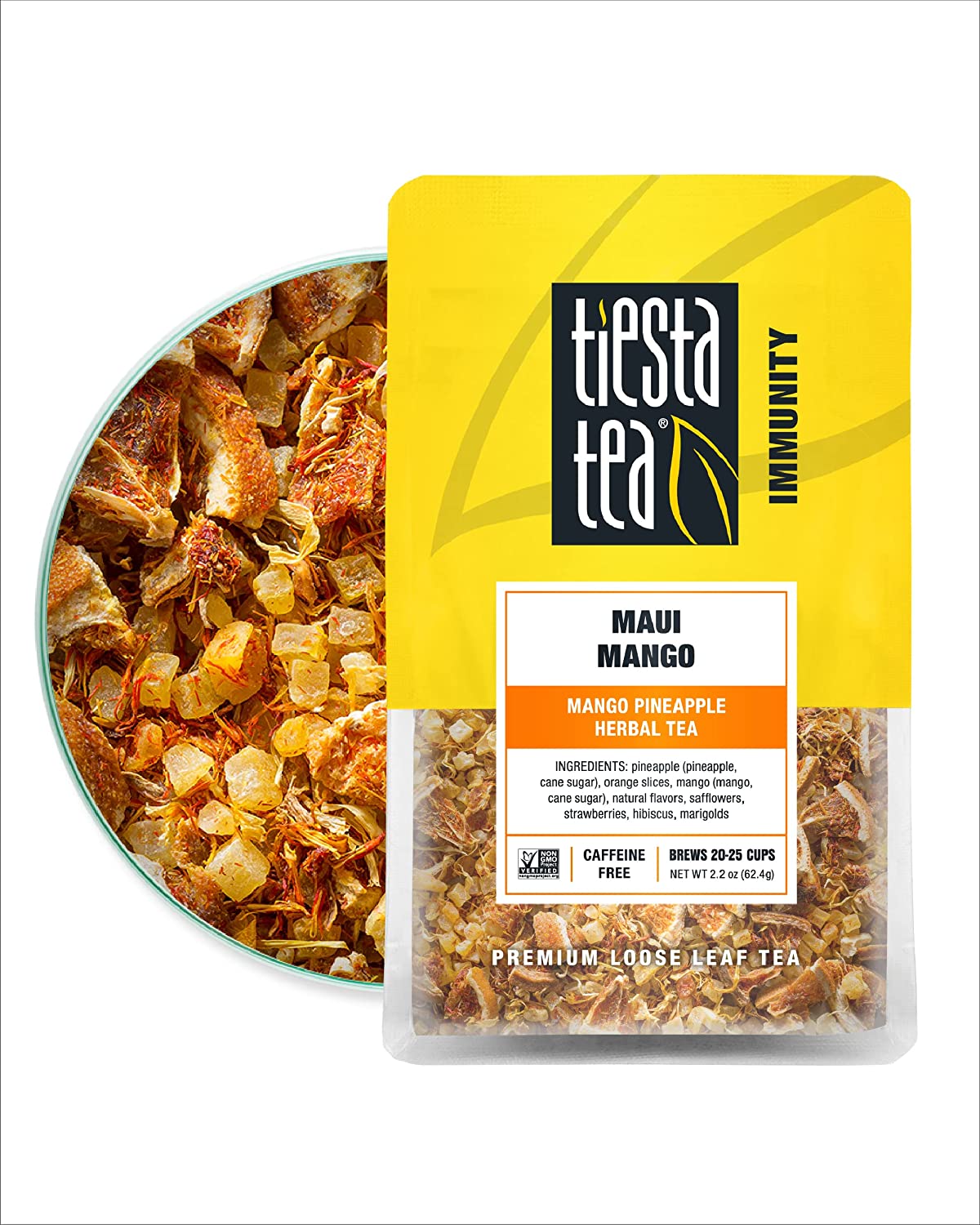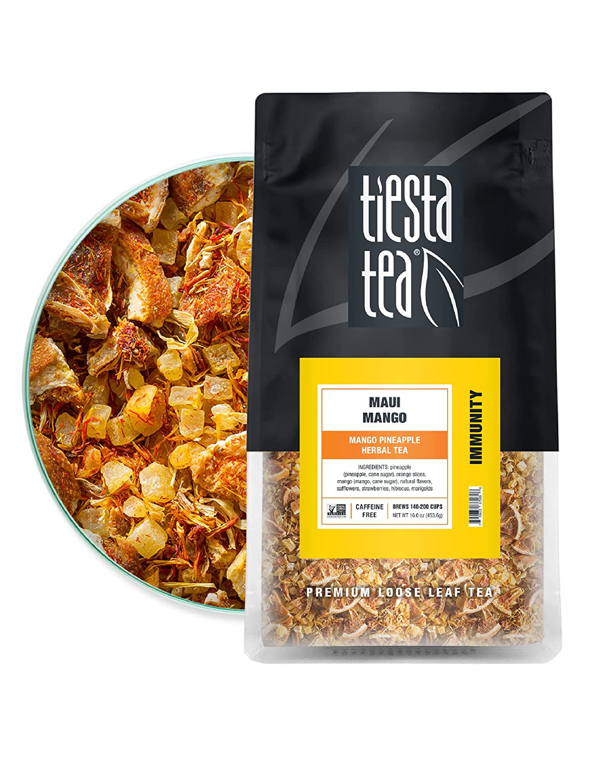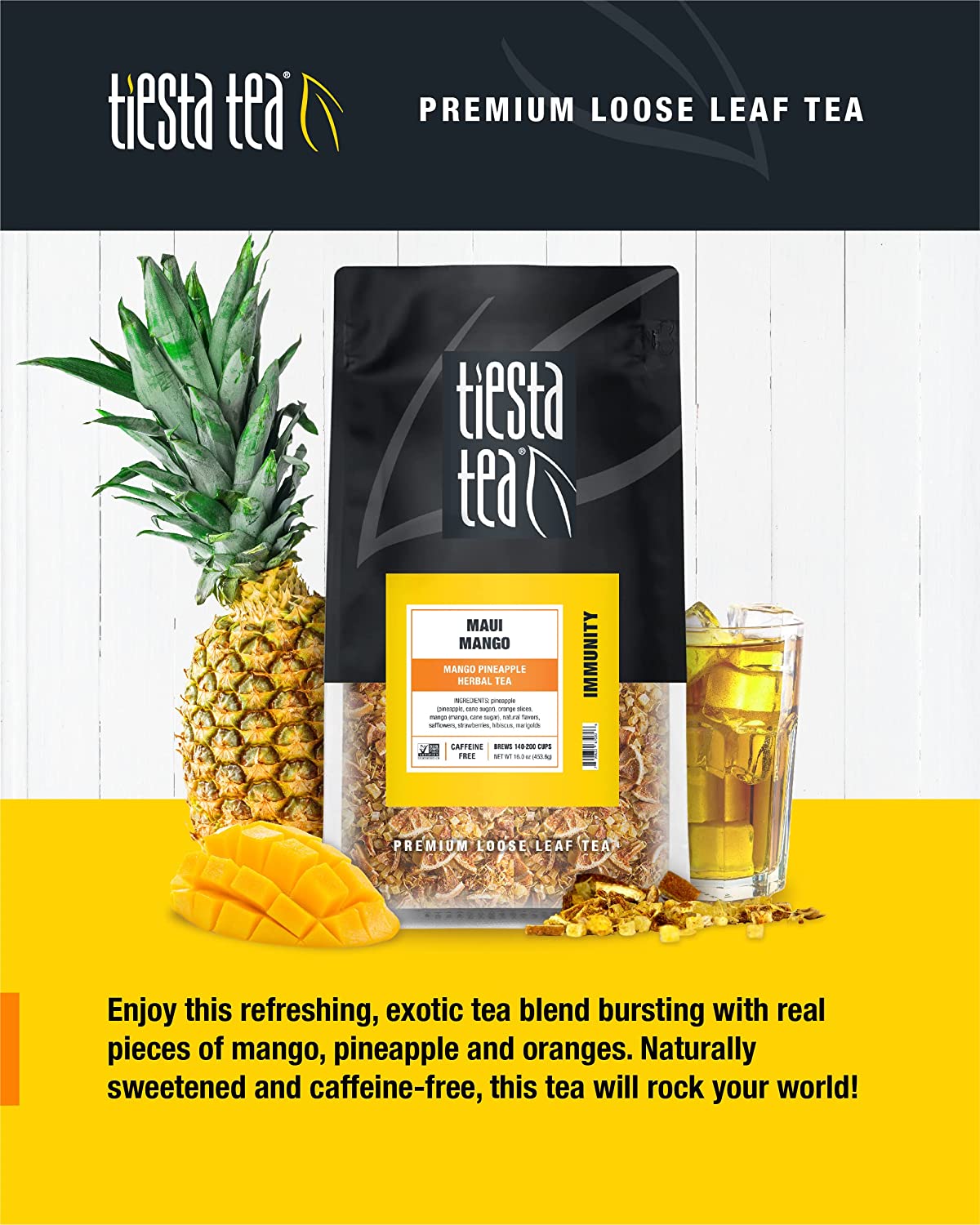 • PREMIUM LOOSE LEAF TEA BLEND of mango, pineapple + oranges is a caffeine free tea and immunity booster; premium ingredients that you can see, smell, and taste; ditch the single-use herbal tea bags; discover the loose leaf difference