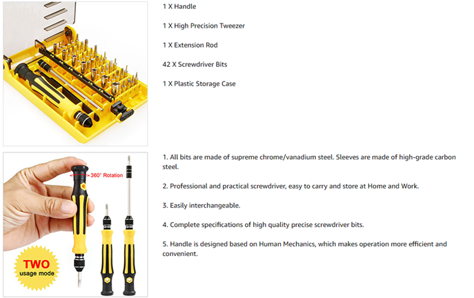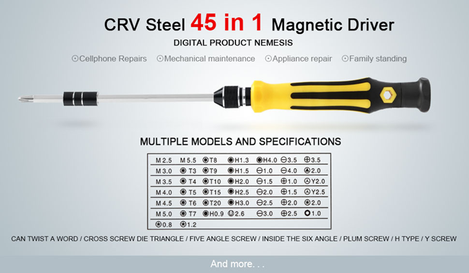 • 45 in 1 mutil function precision screwdriver set,easily interchangeable.
