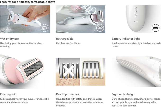 Experience a smooth shave with less nicks, cuts and irritation. SatinShave Advanced cordless electric shaver from Philips is designed to reach even curvy areas on your legs and body for less missed hairs. Hypoallergenic floating foil shaving head maintains close skin contact for an even shave. Pearl tip trimmers next to the foil protect your sensitive skin from irritation. SatinShave is effortless to use, with features that maximize your shaving convenience. Use it wet or dry, in or out of the tub, with antislip grip for easy handling. S-shaped handle allows for a better reach all over your body – and also looks good on your bathroom counter. Rechargeable lithium ion battery provides up to 1 hour of cordless usage after an 8 hour charge. Battery indicator light, so you’re not surprised by a low battery mid shave. Make sure your shaver is fully charged before using for the first time. Includes a trimming comb to attach onto the shaver head for grooming the bikini area.