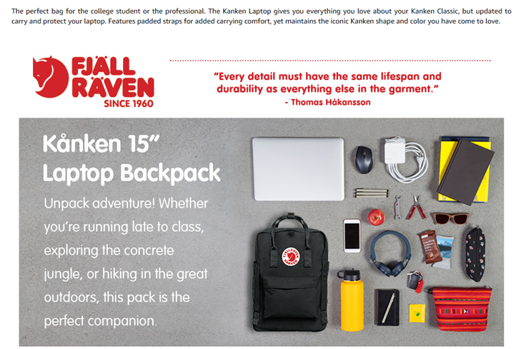 • ICONIC: Classic Kanken with a twist. Same design, updated size. Stash your 15" laptop in its own padded compartment and still have the main compartment and three extra pockets for everything else.