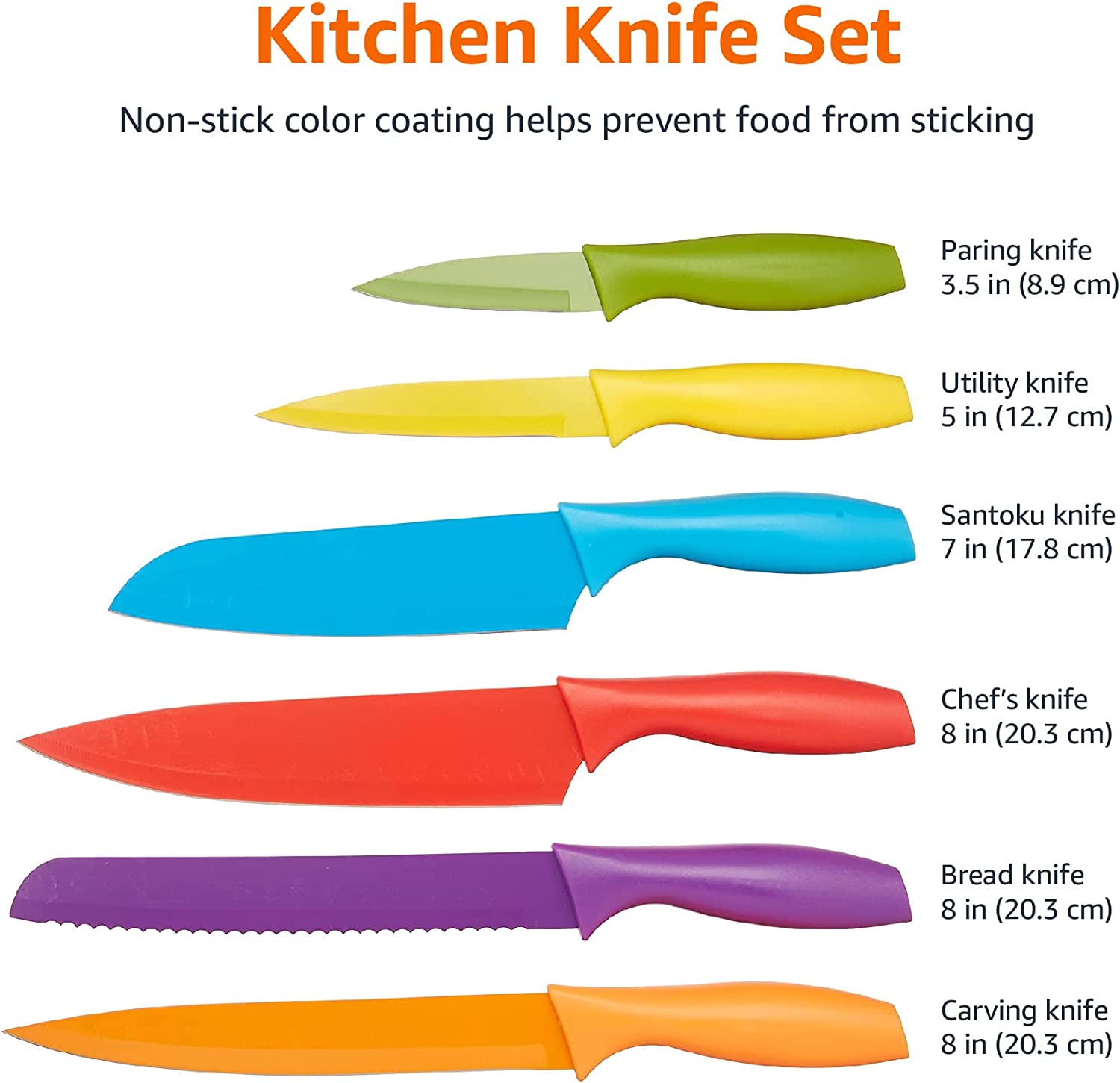 12-piece color-coded knife set includes 6 knives with matching knife covers; Knives include: paring knife, utility knife, Santoku knife, carving knife, chef’s knife, and bread knife