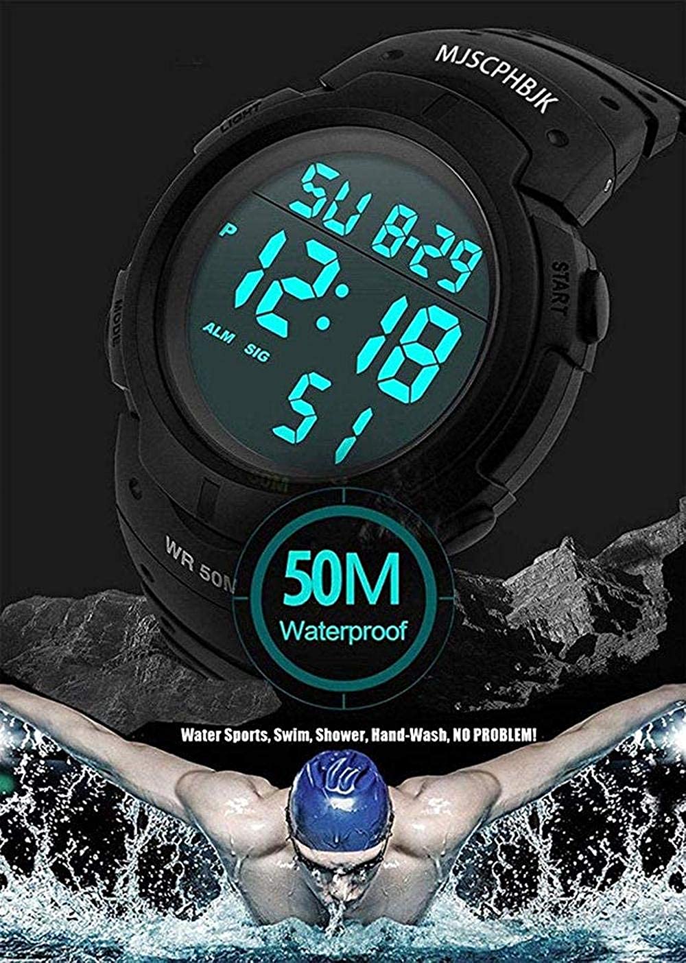 Thickened case to protect its internal parts. Anti-drop and not easy to be worn-out. Square concavesymmetry design, with the overall black color matching, it is of very cool sports style and personality.Specification:Dial Color: Black DialCase Diameter: 1.9 inch / 4.7 cmDial Case Thickness: 0.5 inch / 1.2 cmBand Color: BlackBand width: 0.8 / 2.1 cmBand Length: 9.8 inch / 25 cm(Suitable for 6.7-8.5 inch in circumference wrists to wear)Band Clasp Type: BuckleWatch Weight: 2.4 oz / 68 gBattery Code: CR2025Screw locked back cover, highly waterproof, easy to replace the battery.164FT 50M WATERPROOF, SWIM, SHOWER, NO PROBLEM! DESIGN for SPORT. 50M 5ATM water resistant.NOTE: please DO NOT press any buttons in the water. Military 24H time mode and imported EL back light functions make it perfect for all kind of sport and daily use.Material: Case Material: Silicon Rubber, Plastic Band Material: Silicon Rubber Mirror Surface: Mineral Glass MirrorErgonomic recess and rattlesnake tail-like texture with square hole band design. While accelerating perspiration,it is of strong three-dimensional sense. Loops also consolidate stability of the strapLarge numbers on the dial and with EL Backlight, easy to read, suitable for viewing in dark environment, very convenient.Multi-functional buttons, simple structure, easy to operate.High quality material makes it lightweight and comfortable to wear.