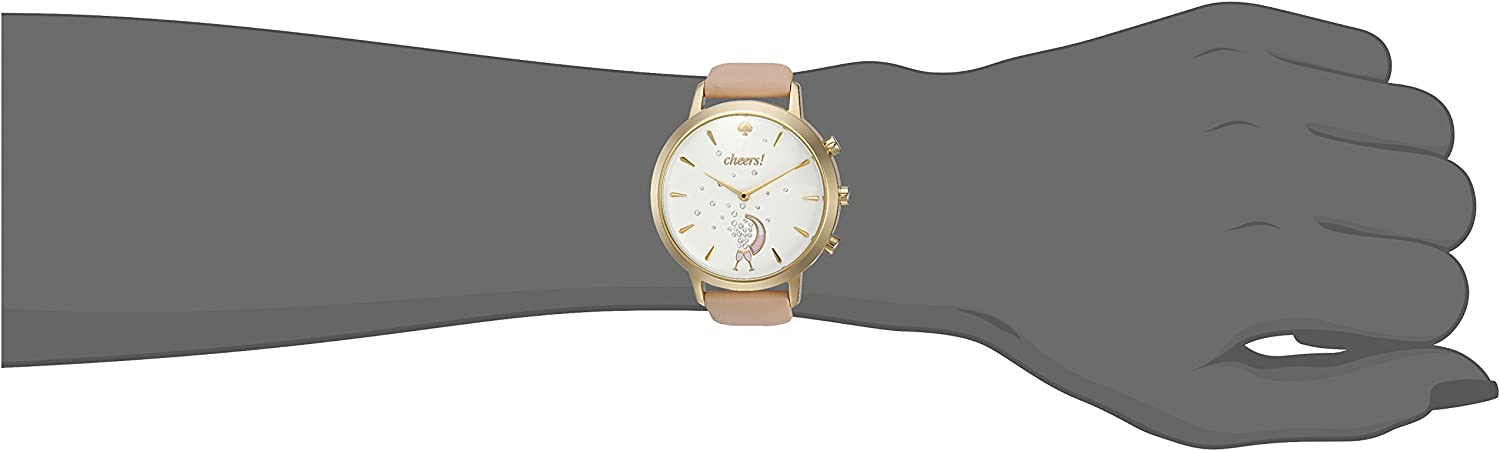 Your watch alerts you with light notifications, controls music, automatically updates time zones, takes selfies and never needs charging. And, with a vachetta leather strap, gold-tone case and classic white dial (with champagne glasses spouting crystal bubbles at the six o'clock index), it's as chic as it is functional. Compatible with Android OS 4.4+ or iPhone 5/iOS 8.2+ and bluetooth smart enabled / 4.1 low energy. The battery life can be up to 6 months and your package includes a caseback changing tool.