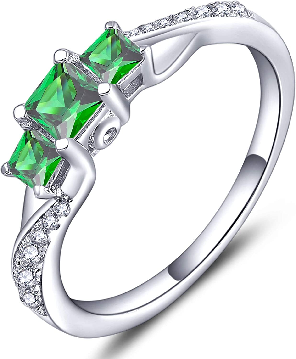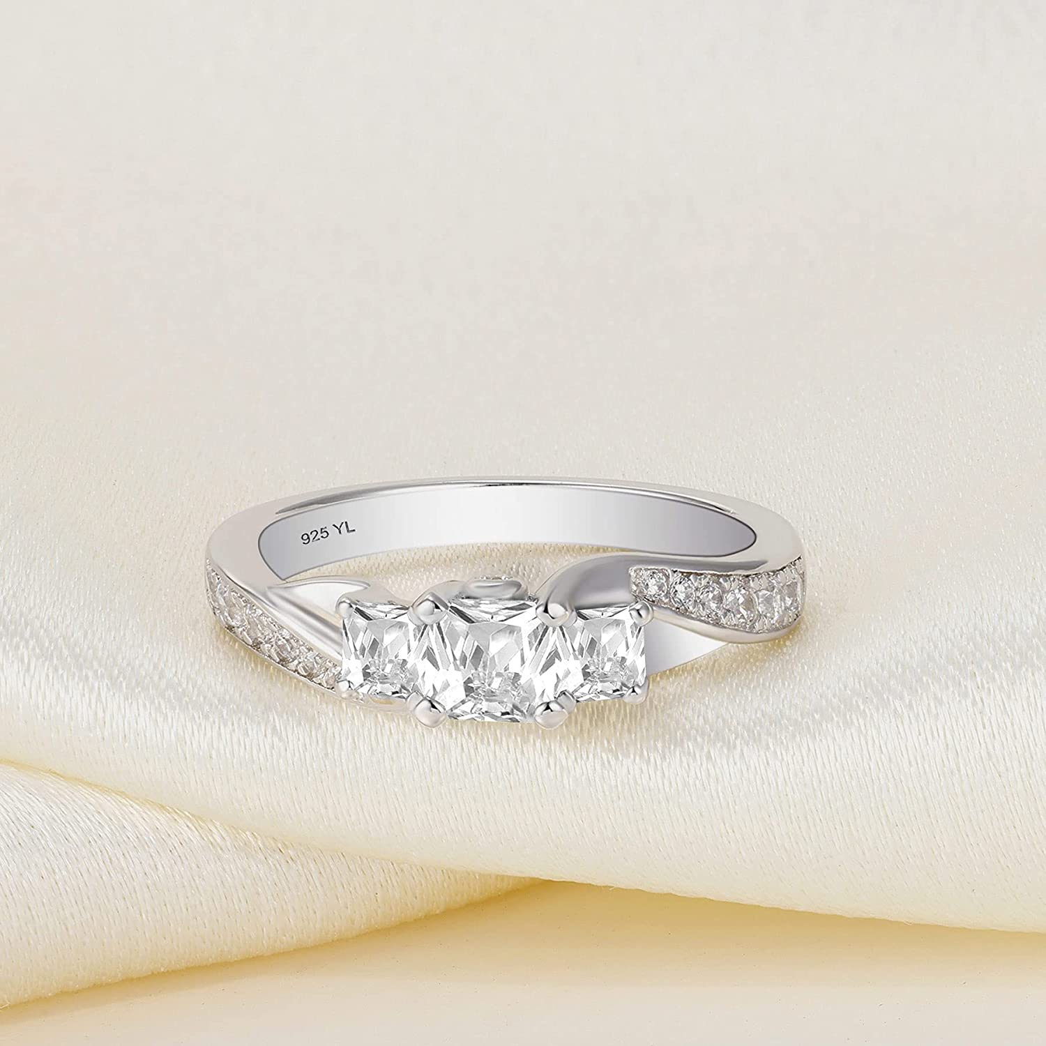 YL Women's Sterling Silver Clear Birthstones 3-stone Princess Cut Wedding Rings for Engagement Jewelry