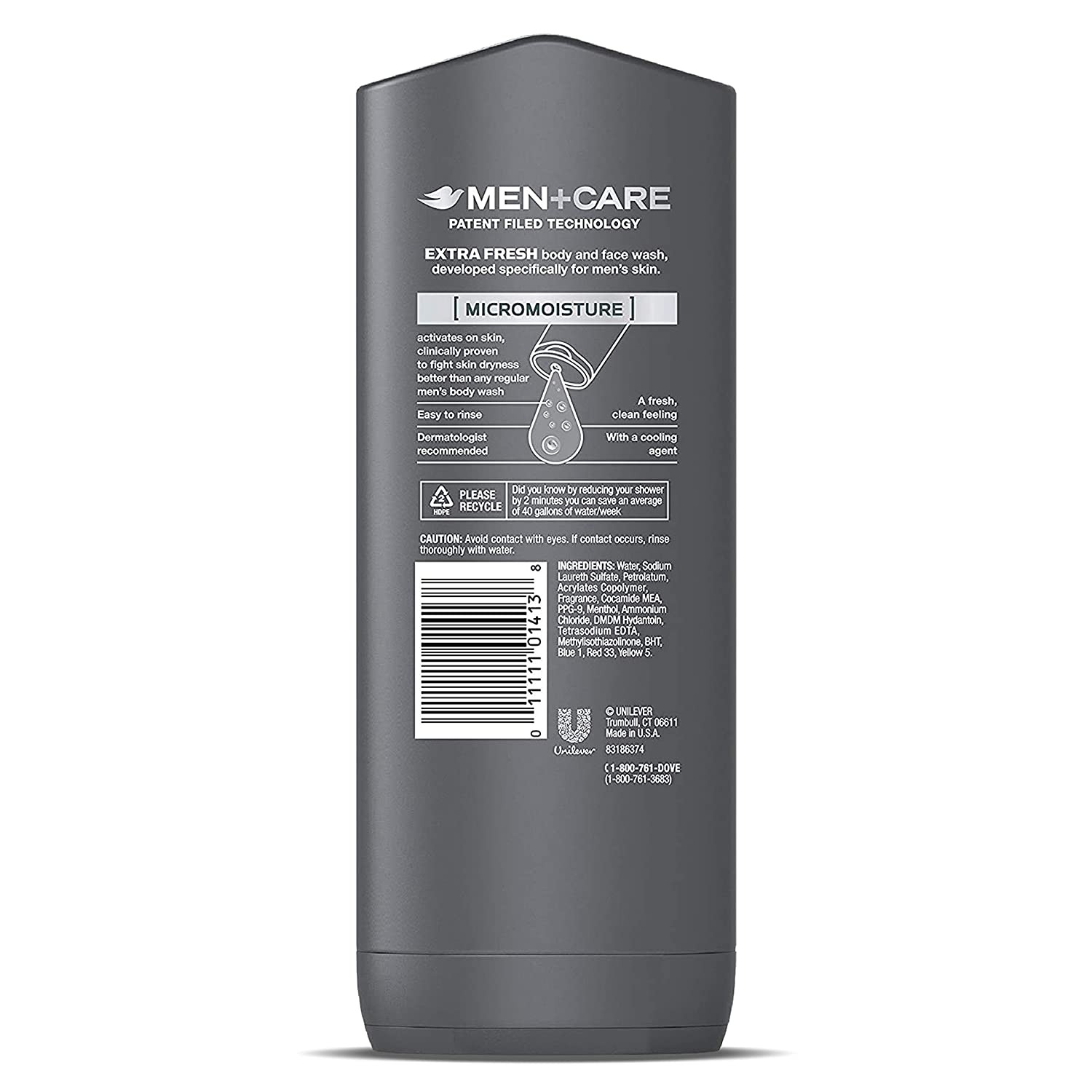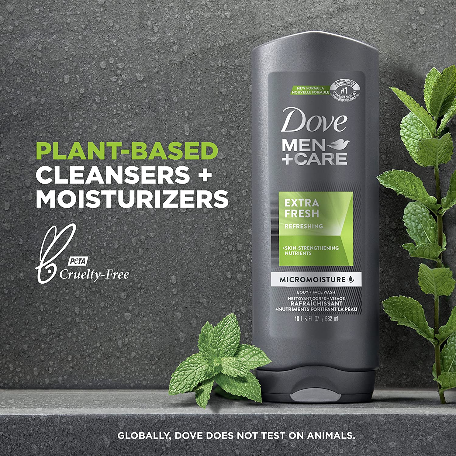 Dove Men+Care Extra Fresh Body and Face Wash is specifically designed for men's skin to leave it hydrated and comforted. Our body wash is powered by MicroMoisture Technology and formulated with plant-based moisturizers and skin-strengthening nutrients to rebuild and strengthen skin.