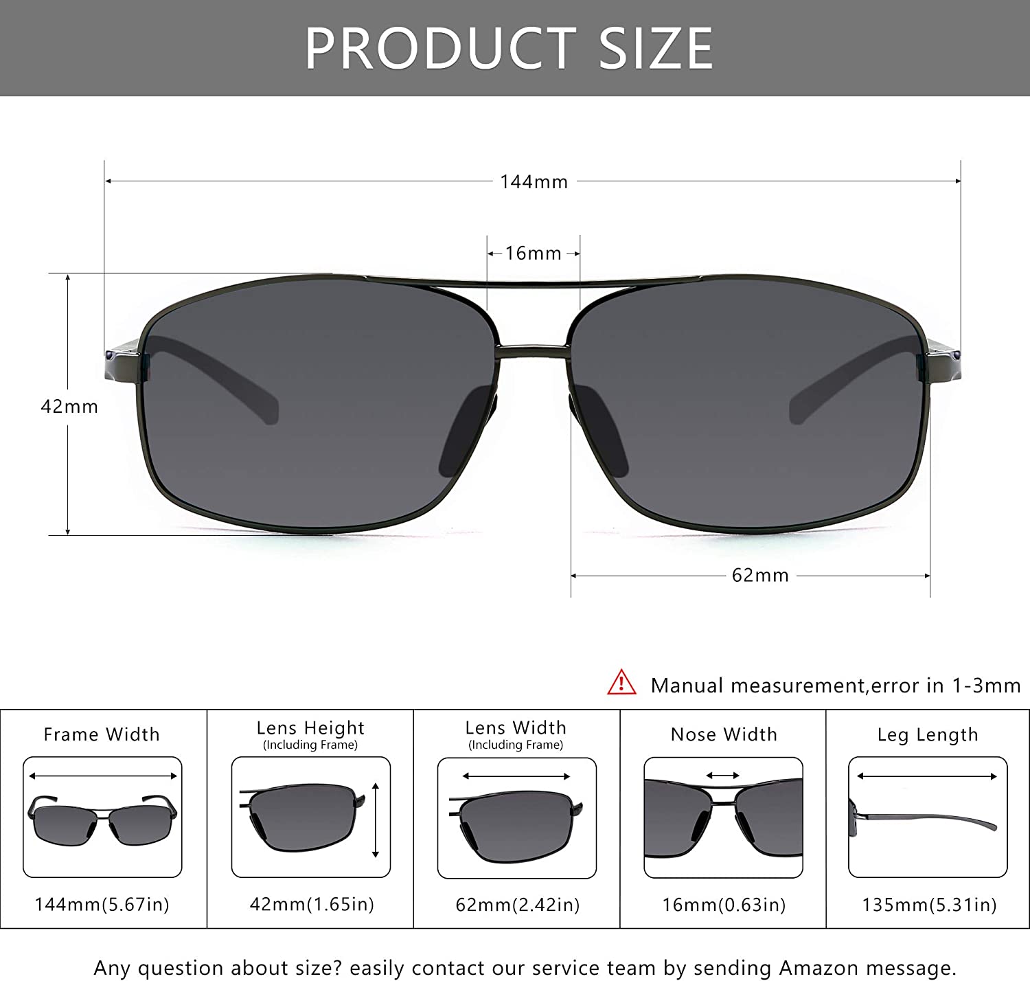 Lens Height: 42 mm (1.65 inches) | Lens Width: 62 mm (2.42 inches) | Nose Bridge: 16 mm (0.63 inches) | Temple Length: 135 mm (5.31 inches) | Frame Length: 144 mm (5.67 inches)