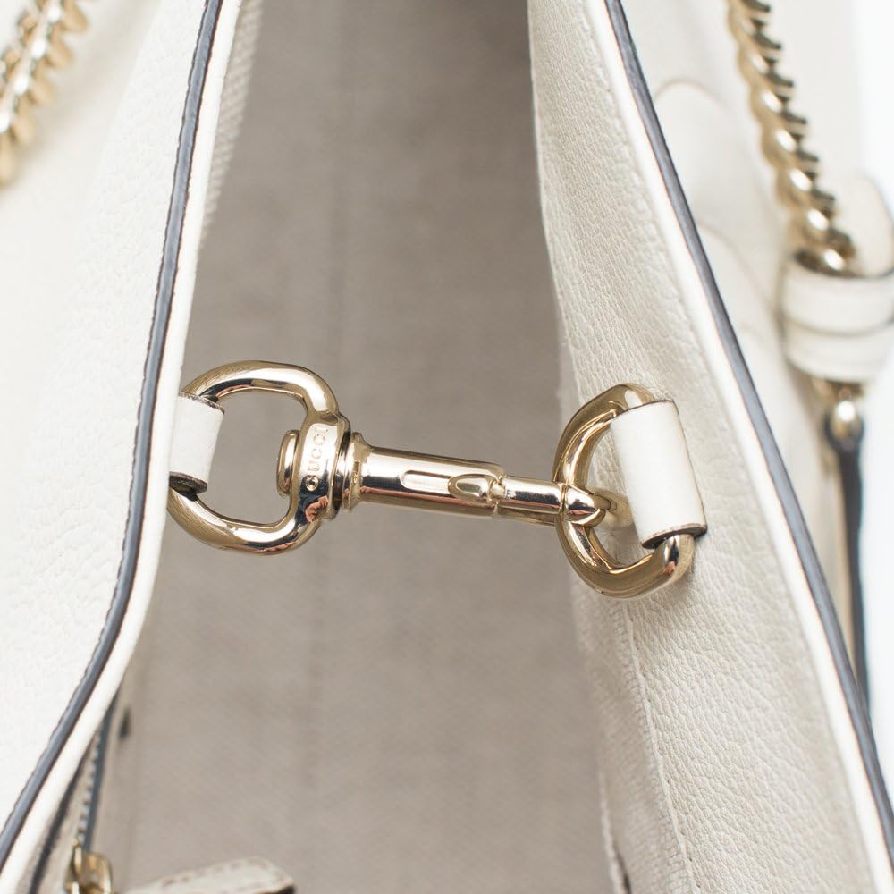 The Gucci Soho Chain Hobo Bag is a medium size shoulder bag with double chain shoulder straps. Featuring a roomy interior with pockets, detachable tassel detail, light gold hardware, and an embossed interlocking GG on front.