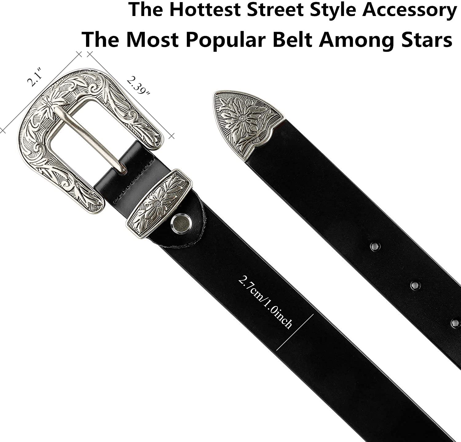 • ✦ Detailed data and Material -Belts strap: 1.1". Buckle length and width: 2.39", 2.1". The strap is made of high quality leather, the buckle is made of zinc alloy, shiny and durable.