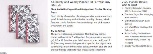 • January 2022 - December 2022 pretty day planner with 12 months of monthly pages for easy year-round planning; 6 additional monthly pages (July 2021 - December 2021) are included