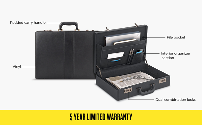 • Black Attaché Case: This classic black briefcase has a large capacity main compartment, an interior organizer section, a file pocket with velcro closure, and dual combination locks to keep your essentials secure