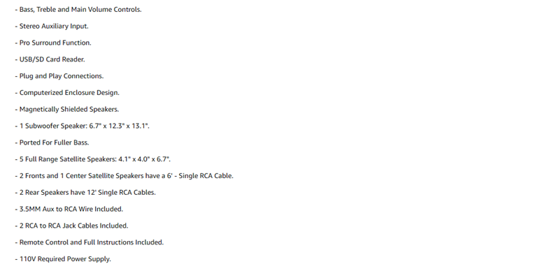 Acoustic Audio by Goldwood AA5172 Bluetooth 5.1 Speaker System Stream music from your phone to the built in Bluetooth Receiver Integrated Power Amplifier with 700 Watts System Power Pro Surround Function Automatically Converts Stereo to 5.1 Sound Easy Plug and Play Connections. Standard RCA inputs connect to most audio sources 6 Independent RCA Inputs for True Surround Stereo RCA AUX Inputs Illuminated Display with Front Panel Controls USB Drive Input and SD Card Input FM Tuner Full Function Remote Magnetically Shielded Wired Satellite Speakers 1 Powered Subwoofer Speaker is (H x W x D) 12.3" x 6.7" x 13.1". Frequency Response is 20Hz-20 kHz Enhanced Bass Boost Ported Design 5 Wired Satellite Speakers are (H x W x D) 6.7" x 4.1" x 4" each 2 Front and 1 Center Satellite Speakers have 6 Foot Single RCA Cables 2 Rear Speakers have 12 Foot Single RCA Cables System Requirements Standard US 110V Grounded Wall Plug Any audio device with a standard 3.5mm Headphone, RCA Stereo or RCA 6 Channel Surround Audio Outputs Search AA5170D for this model with Smart TV Digital Optical Input Applications TV or Home Entertainment System Laptop or Personal Computer DVD or MP3 Player Cell Phone or Tablet Gaming What's in the box 1 Powered Subwoofer Speaker 5 Passive Wired Satellite Speakers Full Function Remote RCA Antenna Cable 3.5mm to RCA Cable RCA to RCA Jack Cable Instruction Manual