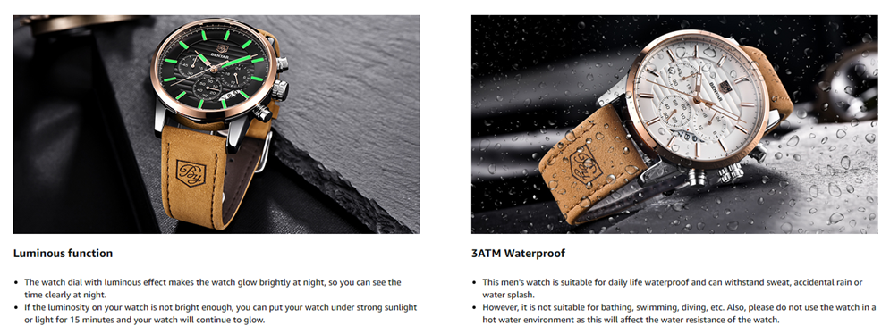 • FULL FUNCTIONAL CHRONOGRAPH AND WATERPROOF: Three Chronograph Sub-dial, Seconds sub-dial, Minute Sub-dial, 24 hour Sub-dial. Waterproof (30 M) - 3ATM. Perfect for all kind of business, casual, indoor and outdoor activities and daily use,but not suitable for swimming, bathing and sauna.