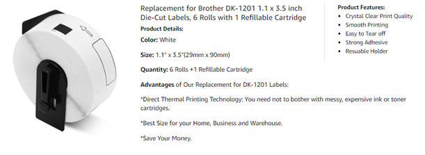 • Specifications: 29mm x 90mm (1-1/7” x 3-1/2”) replacement for Brother DK-1201 labels - 6 Rolls white die-cut standard address labels (400 Labels each roll, in total 2400 labels) with 1 refillable cartridge