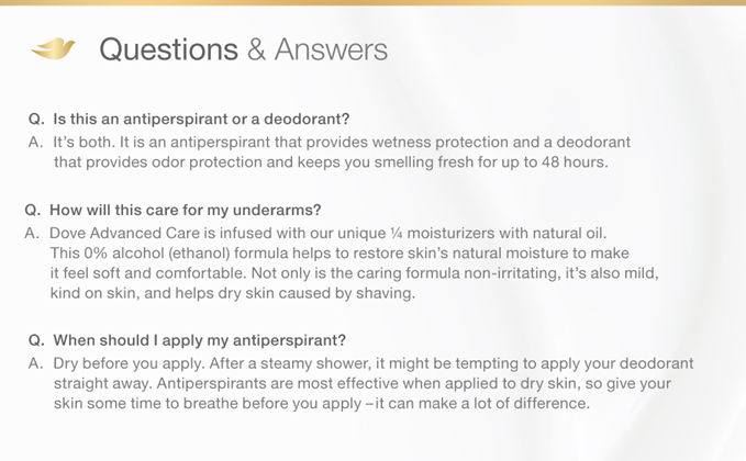 Long-lasting antiperspirant protection, gentle skin care, and a fresh, lavender scent – who says you can’t have it all? Start your day with Dove Advanced Care Lavender Fresh Antiperspirant deodorant.Stick. Enriched with our signature 1/4 moisturizers with natural oil, this antiperspirant stick leaves you with soft, comfortable underarms. Made with a kind-to-skin formula and containing 0 percent alcohol (ethanol), it helps delicate skin recover from underarm irritation caused by shaving. Use this antiperspirant deodorant.regularly to enjoy comfortable and healthy-feeling underarms. Keeping you fresh all day, this gentle antiperspirant for women protects from sweat and odor for up to 48 hours. If you’ve been wondering how to get soft, comfortable underarms. choose our antiperspirant stick and enjoy beautifully fresh underarms.that stay dry all day long. For best results, apply this Dove antiperspirant deodorant.to dry skin after showering and enjoy fresh, comfortably dry skin from morning to night. Dove is certified cruelty-free by PETA because we believe that real beauty is cruelty-free. We’re on a mission to help women raise their self-esteem – because we believe beauty should be a source of confidence, not anxiety. Dove Antiperspirant deodorant. deliver effective underarm protection and are kind to skin, so women can be free of underarm inhibitions and live beautifully unselfconsciously.