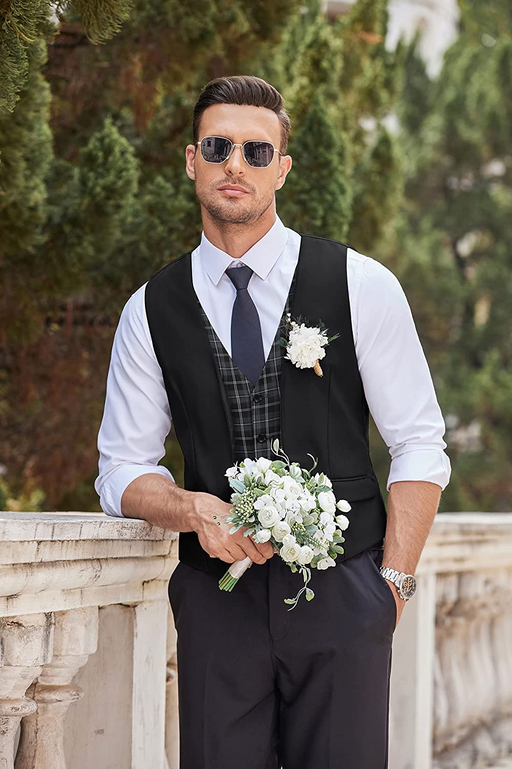 Men's Business Suit Vest Layered Plaid Dress Vest Waistcoat for Wedding,Party