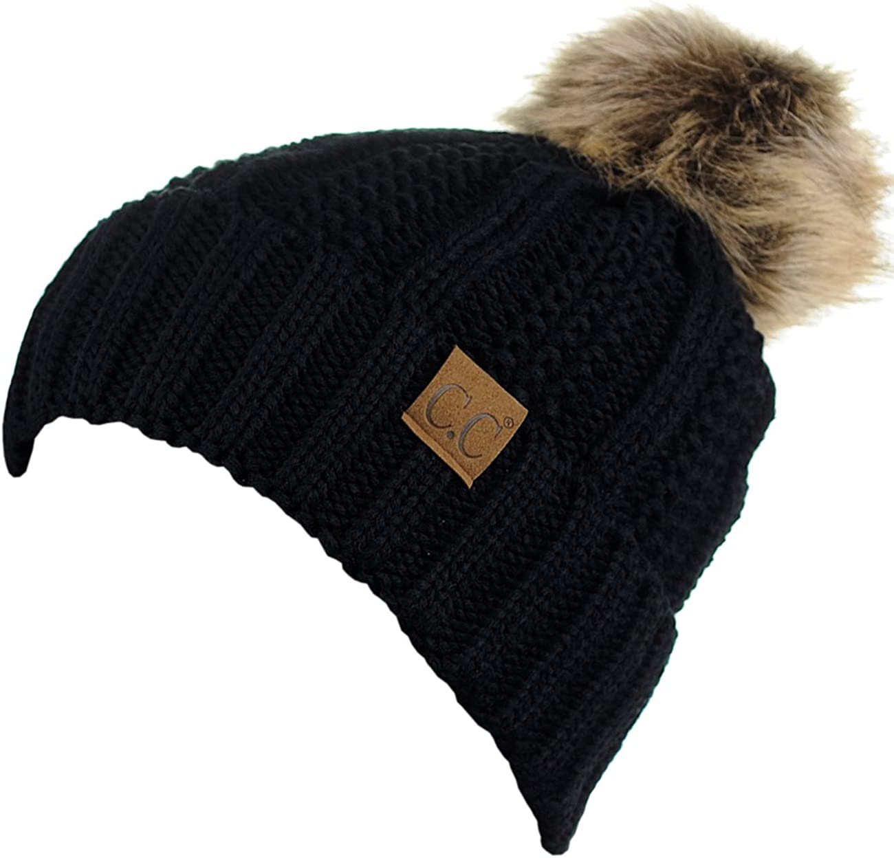 C.C Thick Cable Knit Faux Fuzzy Fur Pom Fleece Lined Skull Cap Cuff Beanie