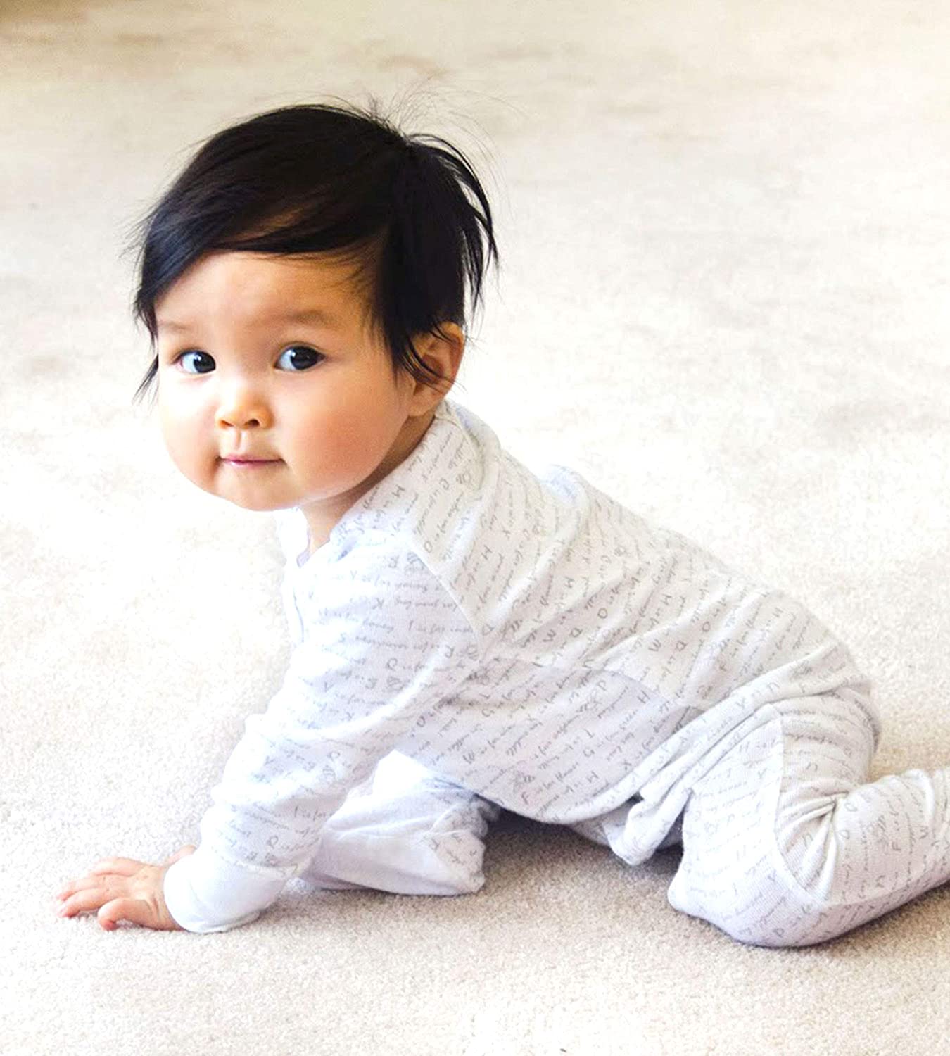 • Diagonal zip front for easy diaper changes & snap tab at neck to protect delicate skin