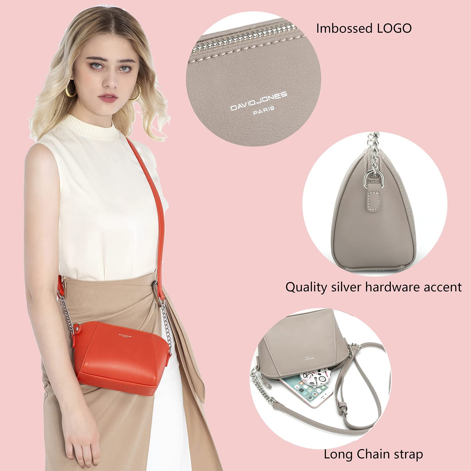 • CONSTRUCTION:Zipper closure for the main compartment;1 internal ZIP pocket;1 internal slip pockets for small essentials;Adjustable Long Strap with chains decorated.Elegant imbossed LOGO NO stratching your dressing. DAVIDJONES woven dust bag for free.