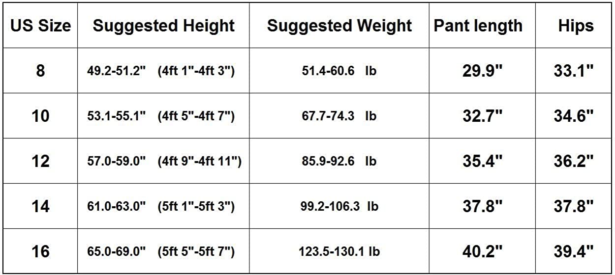 CN Size 150=Size 12 Suggested Height 4ft 9"- 4ft 11" Suggested Weight 85.9-92.6 lb