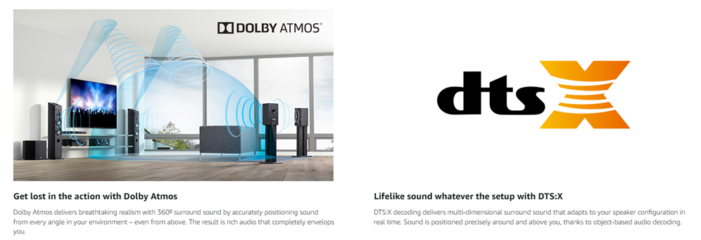 Give your home entertainment system a cinematic upgrade. The powerful 7.2 channel receiver supports the latest three-dimensional surround sound audio formats including Dolby Atmos and DTS: x, drawing you into the middle of the action you see on screen. And with 4K Ultra HD picture quality, and Dolby Vision, that’ll transform your viewing experiences, you’ll enjoy an immersive theater-like experience in the comfort of your own home. Input Output Terminals: Audio Input Opt (1), Audio Input Coax (1), Analog Audio Input (4), Pre Out Subwoofer (2), Headphone Output (1), USB (for power supply only).